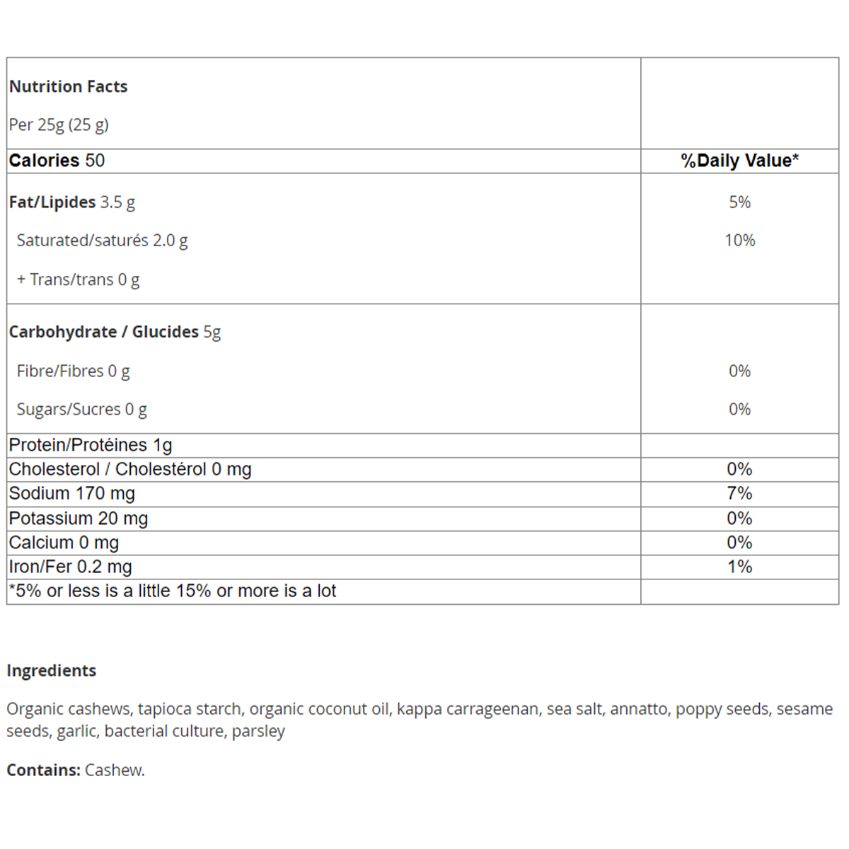 Organic cashews, tapioca starch, organic coconut oil, kappa carrageenan, sea salt, annatto, poppy seeds, sesame seeds, garlic, bacterial culture, parsley