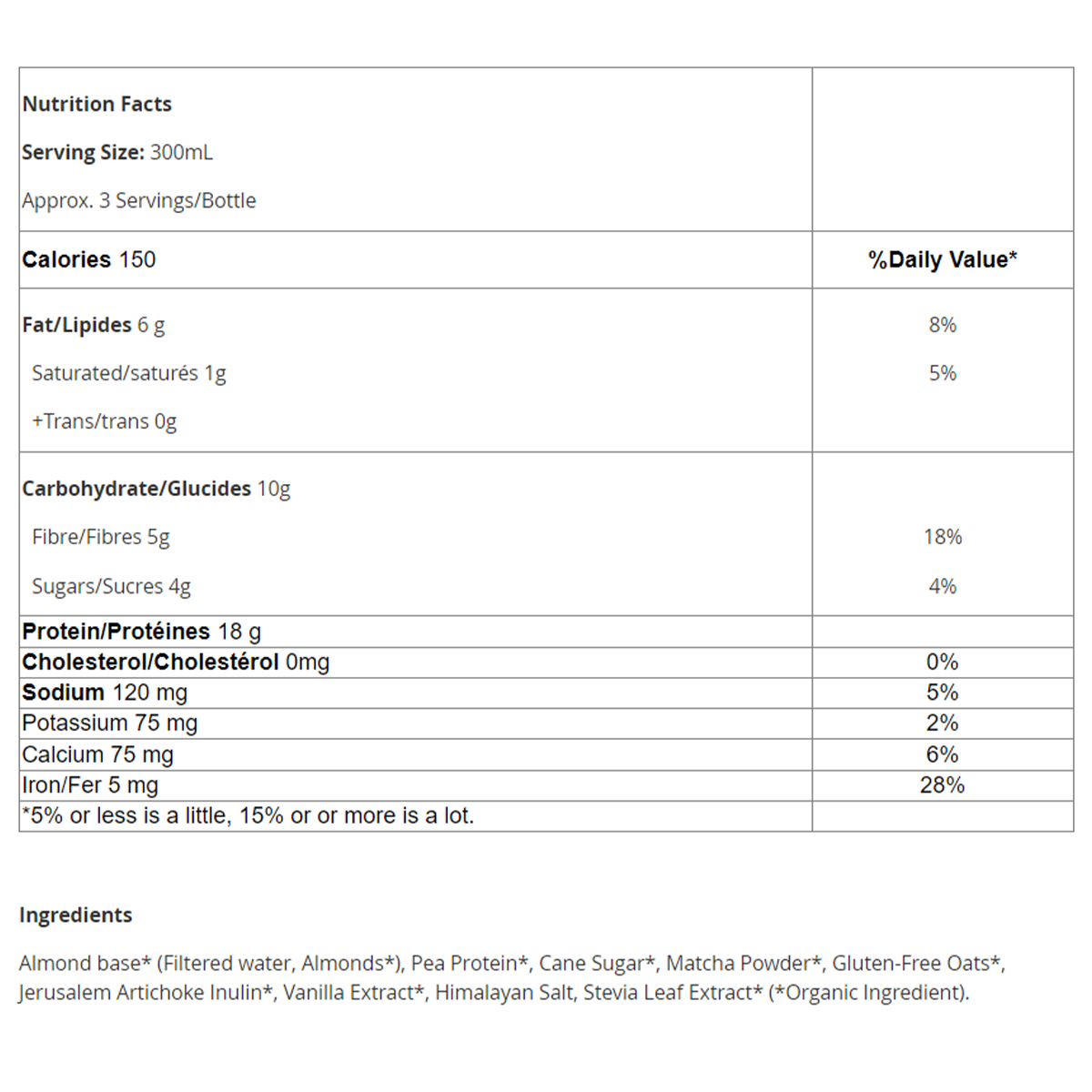 Almond base* (Filtered water, Almonds*), Pea Protein*, Cane Sugar*, Matcha Powder*, Gluten-Free Oats*, Jerusalem Artichoke Inulin*, Vanilla Extract*, Himalayan Salt, Stevia Leaf Extract* (*Organic Ingredient).
