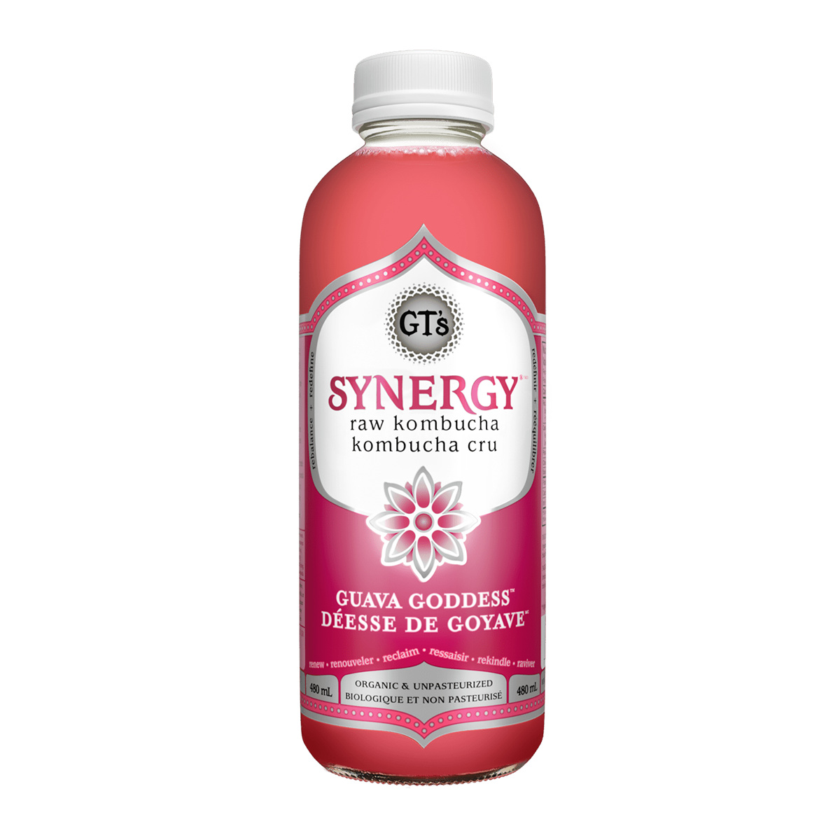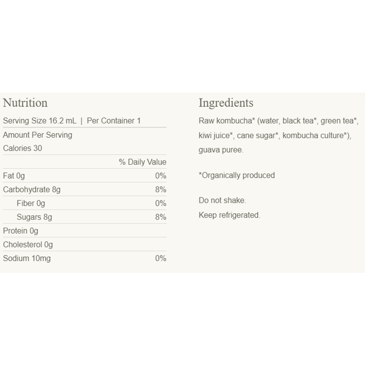 Raw kombucha* (water, black tea*, green tea*, kiwi juice*, cane sugar*, kombucha culture*), guava puree.