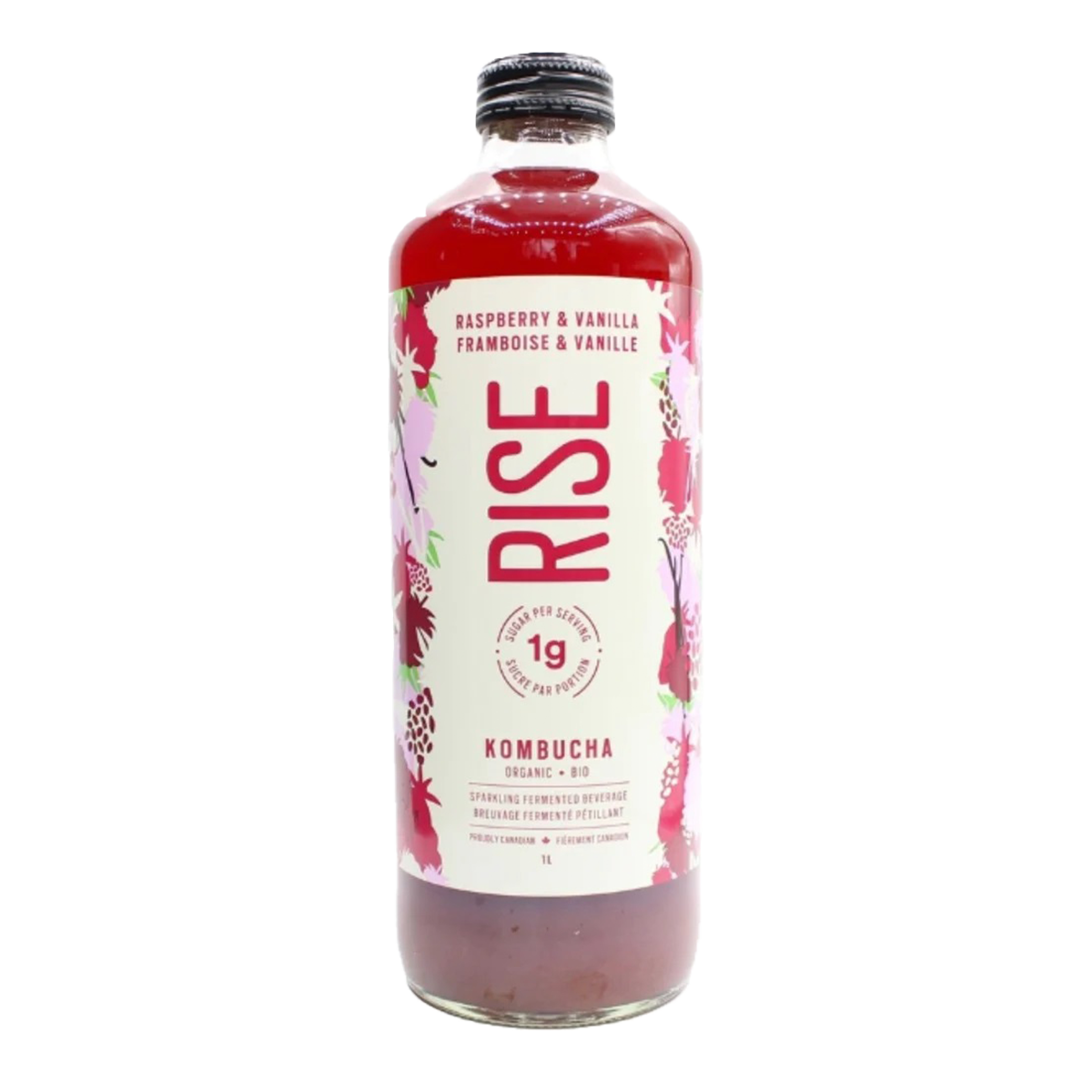 Rise Low Sugar Raspberry & Vanilla Kombucha is a refreshing fermented drink that blends the tangy flavor of raspberry with sweet vanilla notes. Crafted from filtered water, raspberry juice, active kombucha culture, and a blend of oolong tea, elderflower, and white tea, it's enhanced with natural raspberry and strawberry flavors. The drink also features subtle floral hints from hibiscus flower, the richness of vanilla extract and powder, and a touch of sweetness from stevia extract. To preserve its quality and live cultures, keep this kombucha refrigerated.