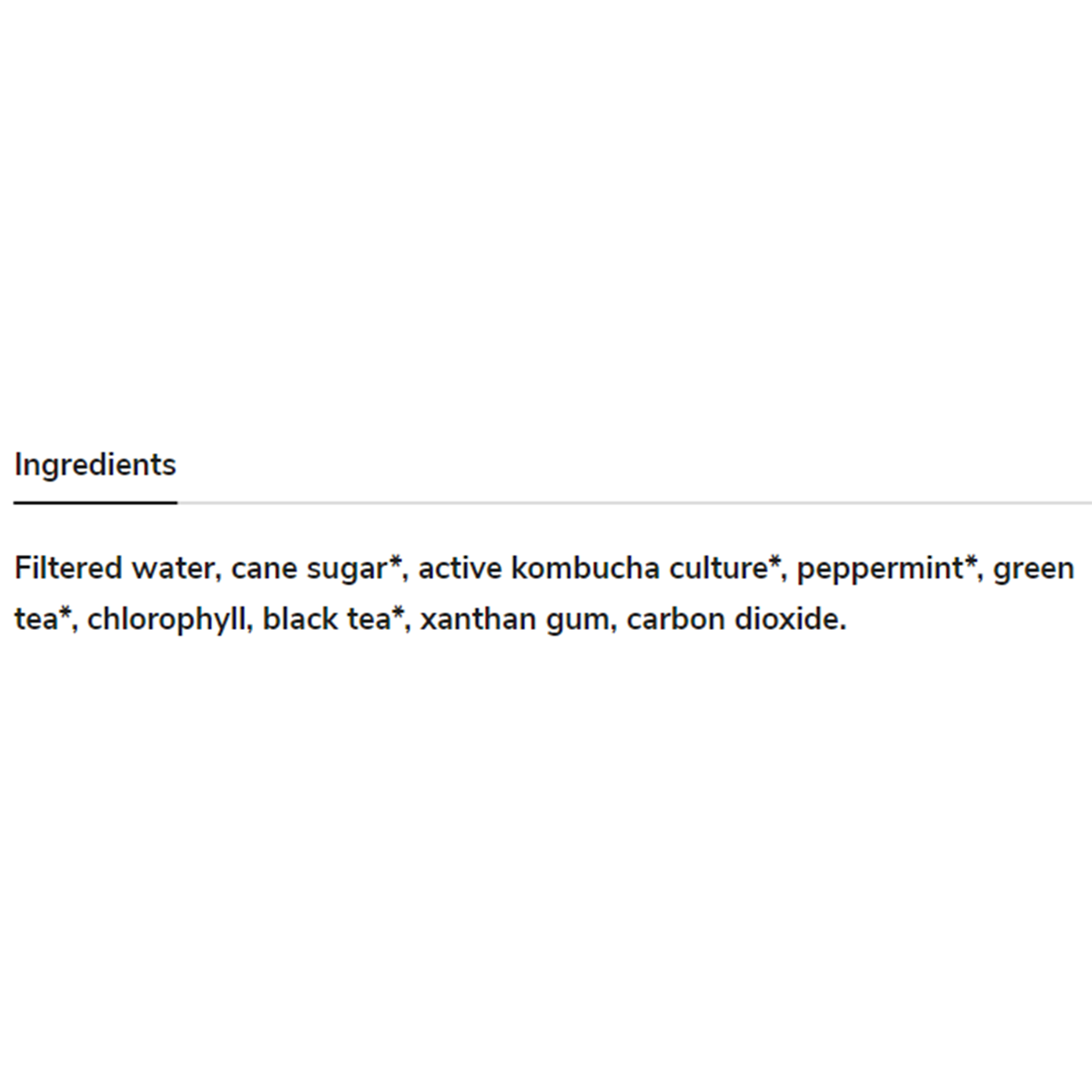 Filtered water, cane sugar*, active kombucha culture*, peppermint*, green tea*, chlorophyll, black tea*, xanthan gum, carbon dioxide.