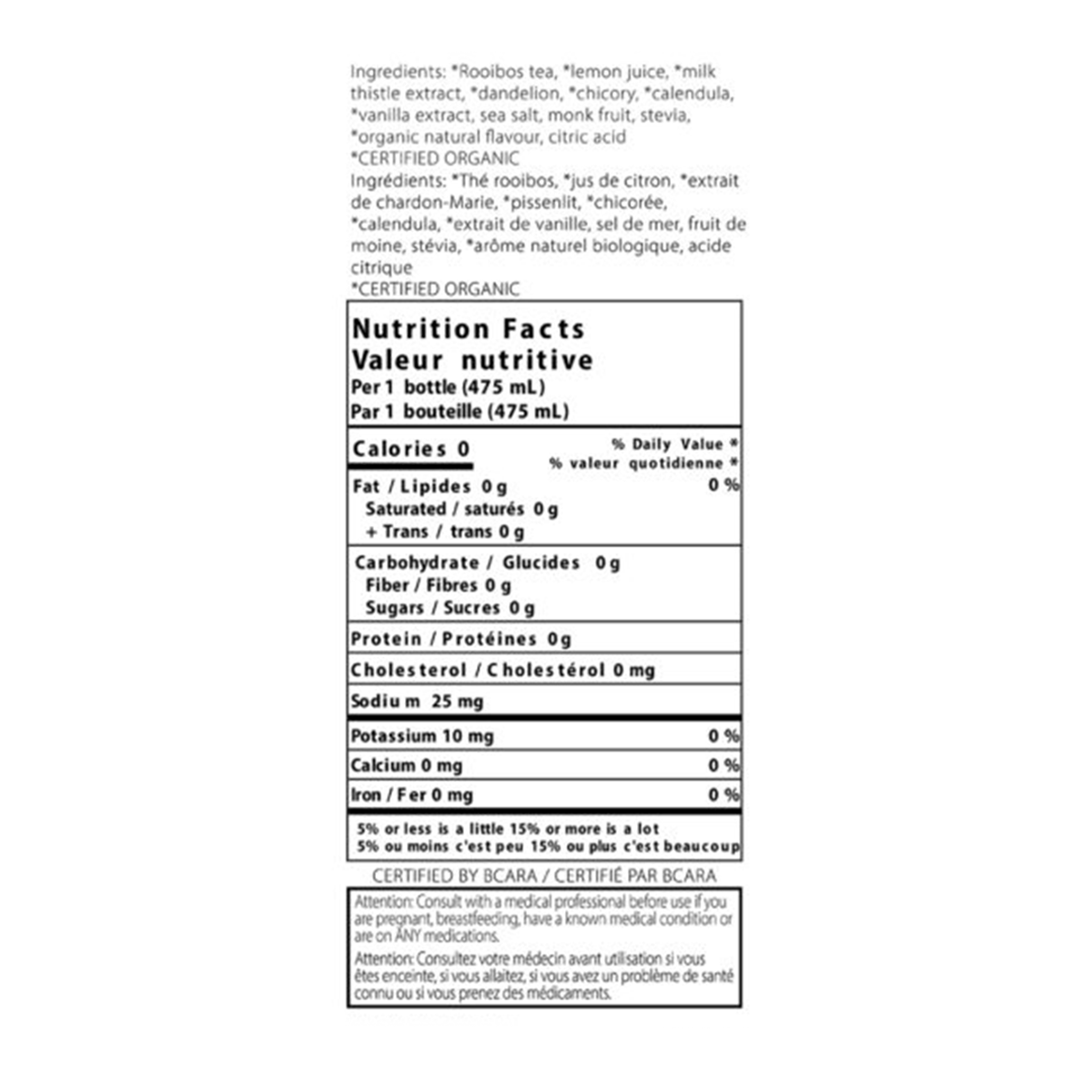 *Rooibos tea, *lemon juice, *milk thistle extract, *dandelion, *chicory, *calendula, *vanilla extract, sea salt, monk fruit, stevia, *organic natural flavour, citric acid.