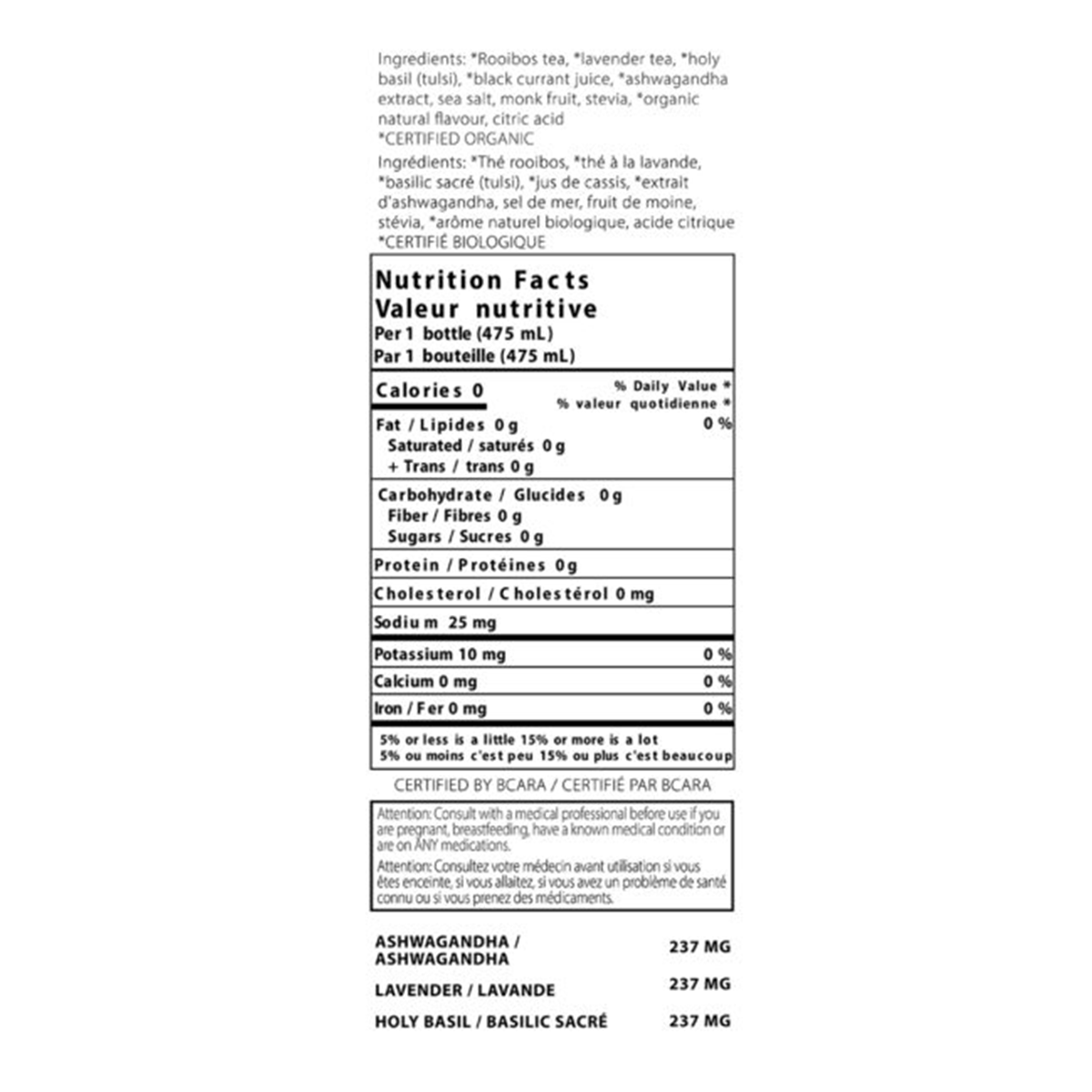 *Rooibos tea, *lavender tea, holy basil (tulsi), *black currant juice, *ashwagandha extract, sea salt, monk fruit, stevia, *organic natural flavour, citric acid *CERTIFIED ORGANIC