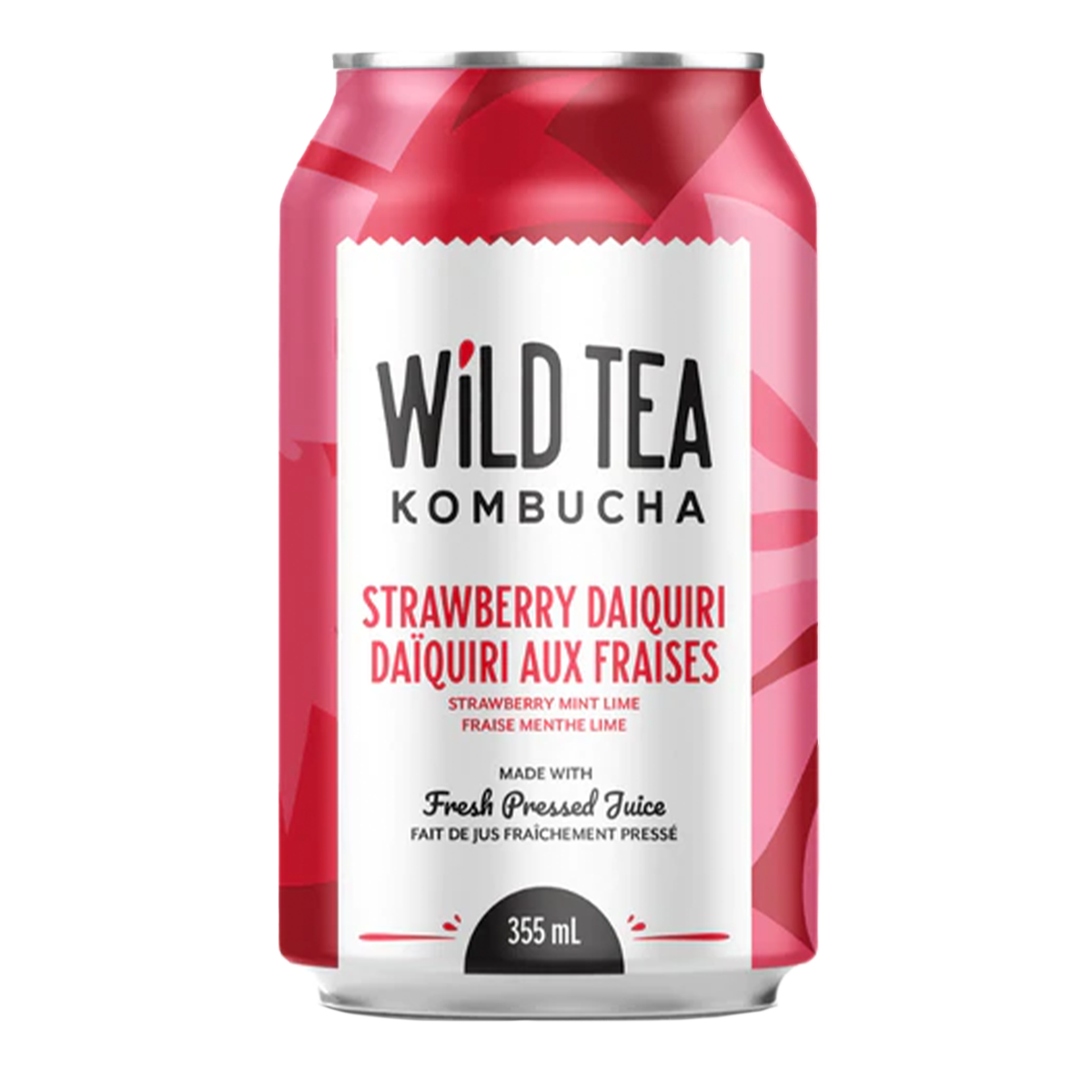 Raw kombucha* (Brewed tea* [Filtered water, Green tea*, Black tea*], Cane sugar, Kombucha culture), Juice blend (Strawberry juice, Strawberry juice concentrate, Lime juice concentrate), Mint tea, Natural flavours. (*Organic)