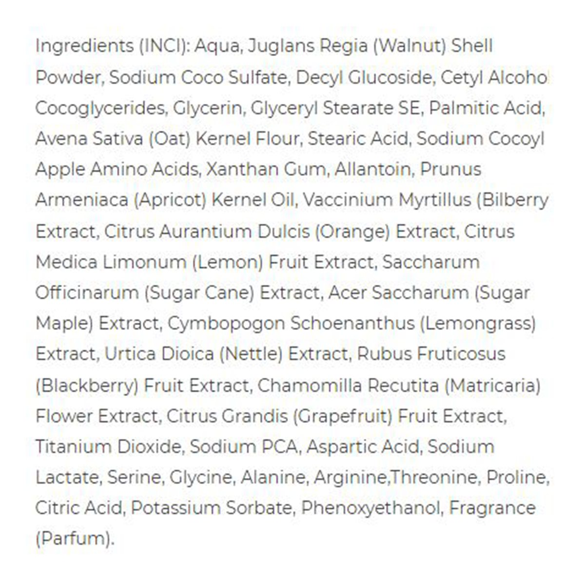 Aqua, Juglans Regia (Walnut) Shell Powder, Sodium Coco Sulfate, Decyl Glucoside, Cetyl Alcohol, Cocoglycerides, Glycerin, Glyceryl Stearate SE, Palmitic Acid, Avena Sativa (Oat) Kernel Flour, Stearic Acid, Sodium Cocoyl Apple Amino Acids, Xanthan Gum, Allantoin, Prunus Armeniaca (Apricot) Kernel Oil, Vaccinium Myrtillus (Bilberry) Extract, Citrus Aurantium Dulcis (Orange) Extract, Citrus Medica Limonum (Lemon) Fruit Extract, Saccharum Officinarum (Sugar Cane) Extract, Acer Saccharum (Sugar Maple) Extract, Cymbopogon Schoenanthus (Lemongrass) Extract, Urtica Dioica (Nettle) Extract, Rubus Fruticosus (Blackberry) Fruit Extract, Chamomilla Recutita (Matricaria) Flower Extract, Citrus Grandis (Grapefruit) Fruit Extract, Titanium Dioxide, Sodium PCA, Aspartic Acid, Sodium Lactate, Serine, Glycine, Alanine, Arginine,Threonine, Proline, Citric Acid, Potassium Sorbate, Phenoxyethanol, Fragrance (Parfum).