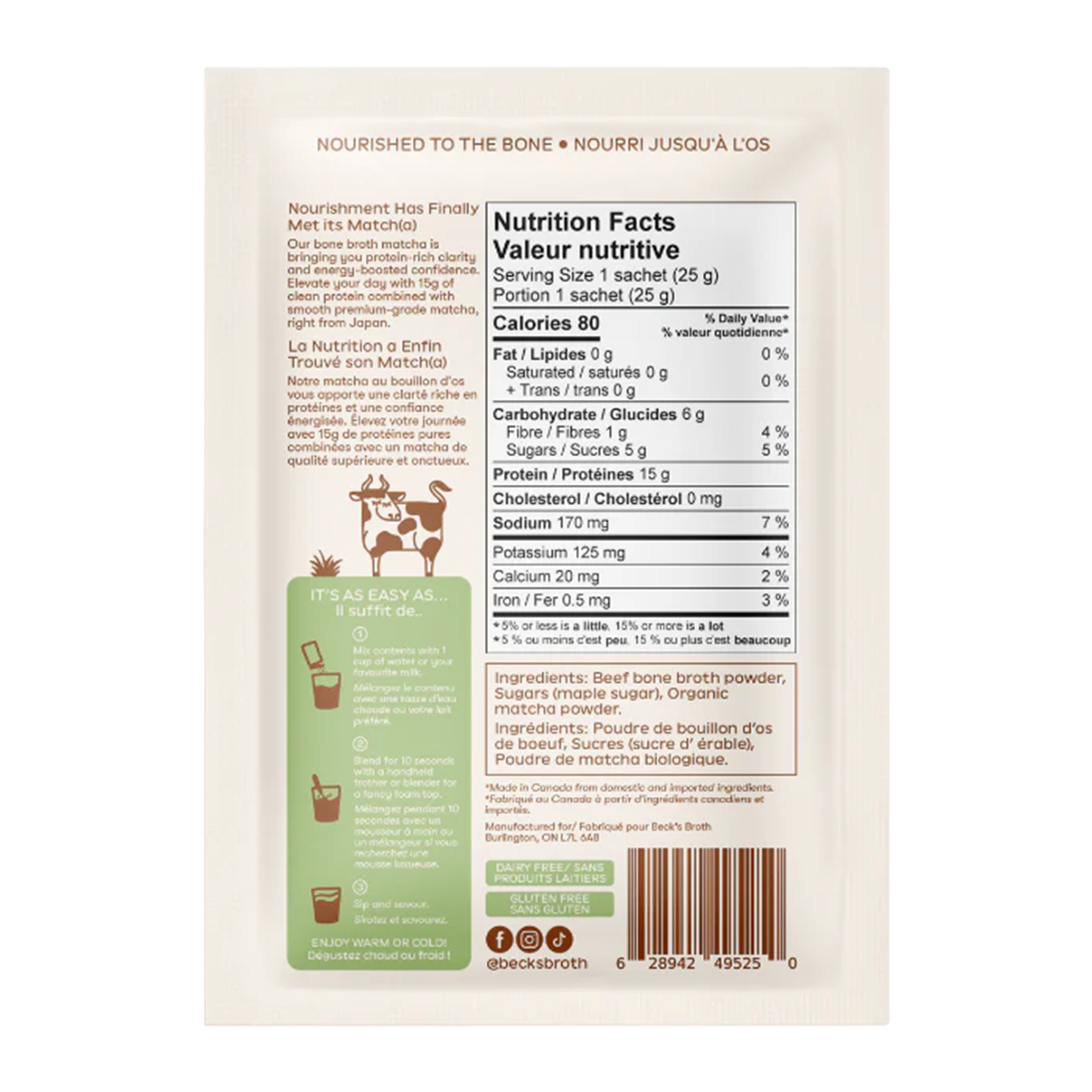 Introducing a matcha experience like no other—Beck’s Broth Bone Broth Matcha combines protein-rich nourishment with energy-boosting clarity. Elevate your day with 15g of clean protein paired with smooth organic matcha, sourced from Japan's Aichi and Uji regions. Nourishment has finally met its matcha!