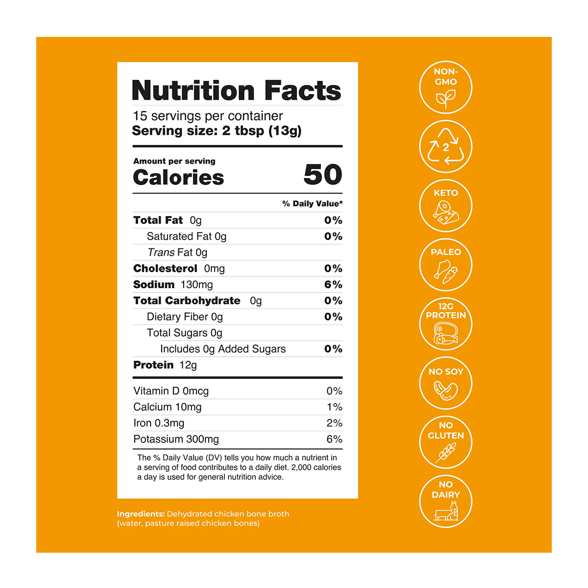 Dehydrated chicken bone broth (water, pasture raised chicken bones)
