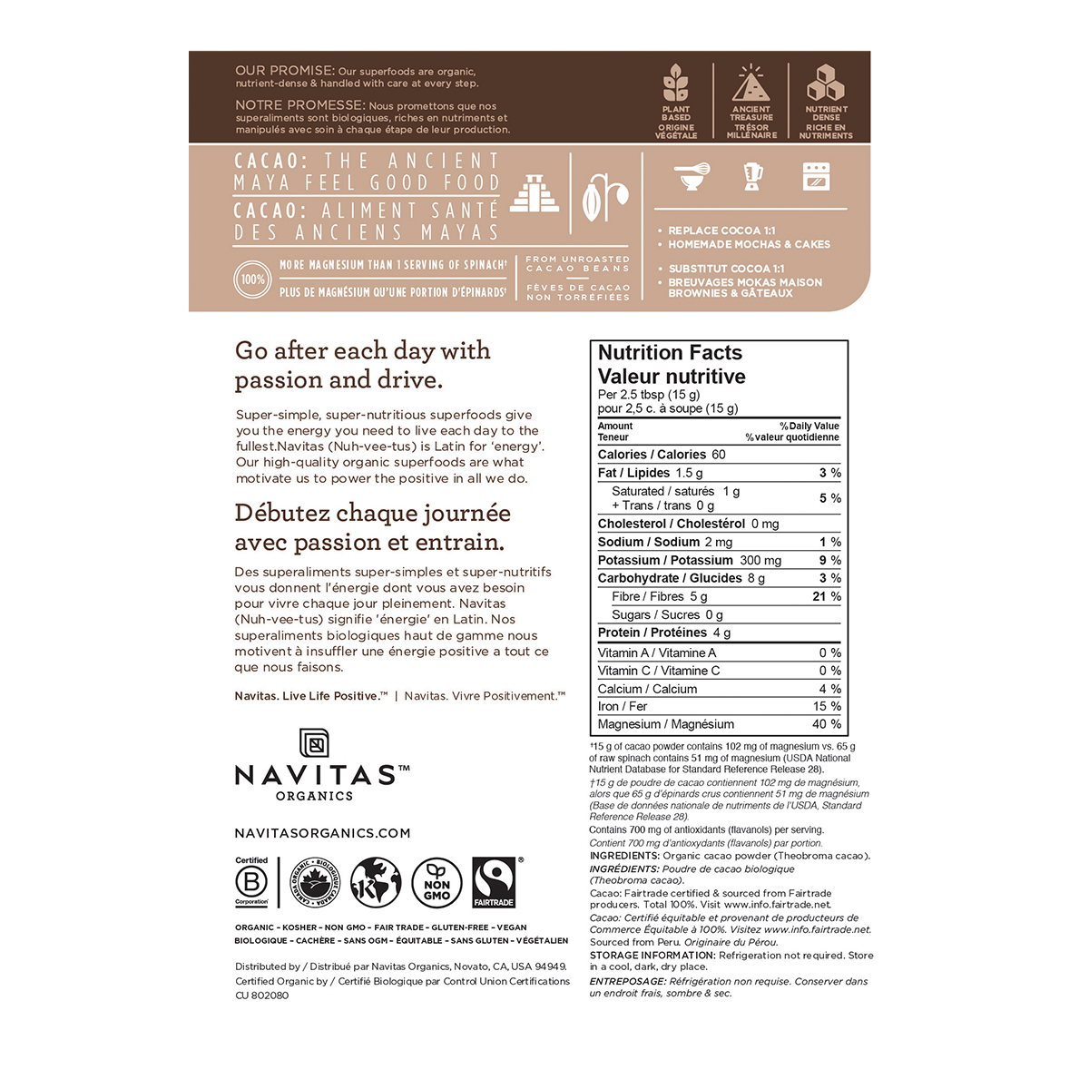 Navitas Organics Cacao Powder is made from traceable, Fairtrade certified and Regenerative Organic Certified cacao beans.