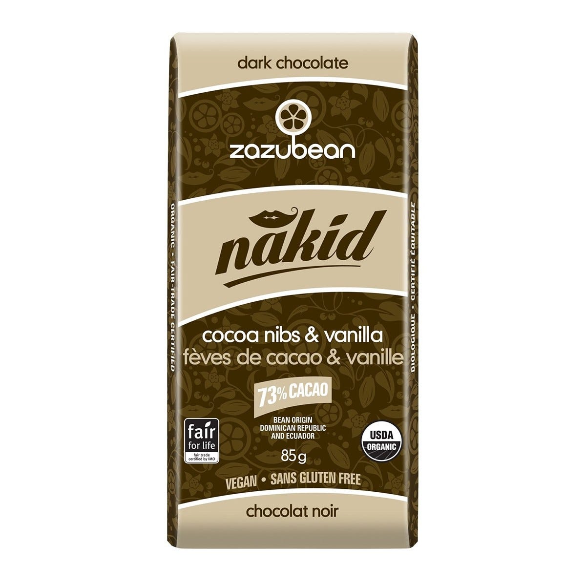Zazubean Organic Dark Chocolate Nakid Bar Cocoa Nibs & Vanilla 85g