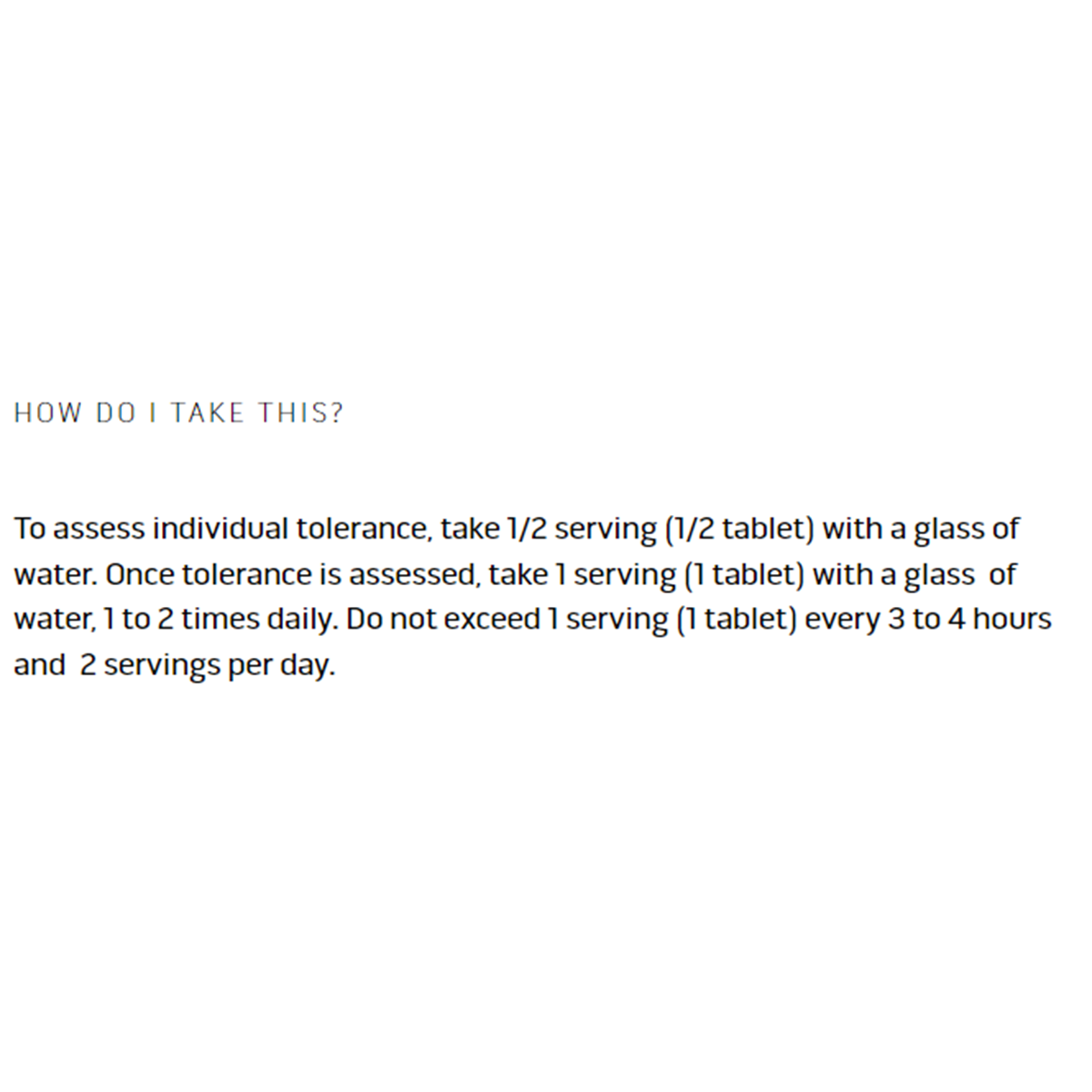To assess individual tolerance, take 1/2 serving (1/2 tablet) with a glass of water. Once tolerance is assessed, take 1 serving (1 tablet) with a glass of water, 1 to 2 times daily. Do not exceed 1 serving (1 tablet) every 3 to 4 hours and 2 servings per day.