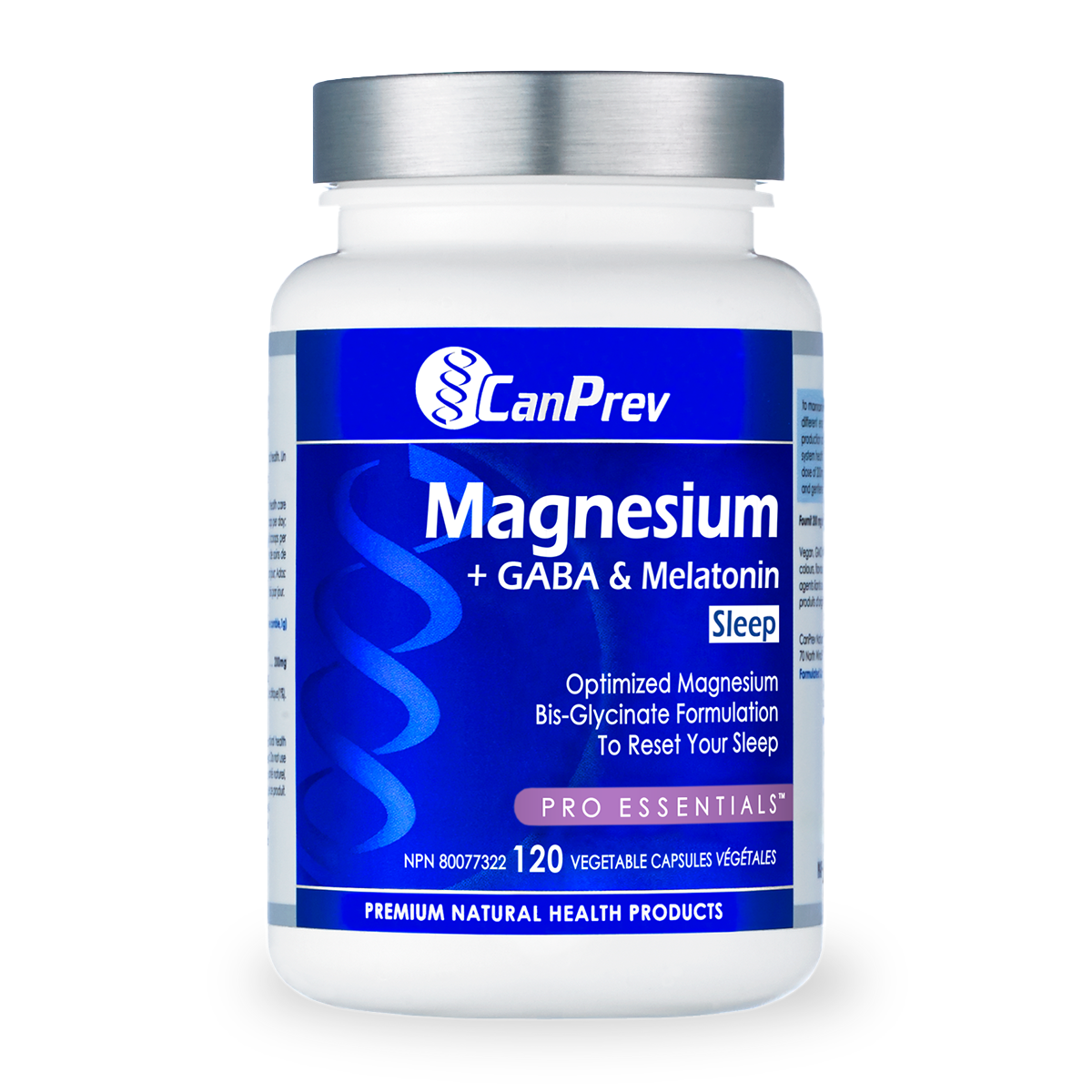 Magnesium is essential in over 350 different enzymatic functions in your body, from DNA synthesis and energy production to proper muscle function and nervous system health. This proprietary magnesium-glycine complex provides a therapeutic 125mg of magnesium bis-glycinate, 100mg of GABA (gamma-aminobutyric acid) and 2.5mg of melatonin as natural Restful-Restful-Sleep aids with every vegetable capsule. No fillers or flavours. Just what you’ve come to expect from CanPrev.