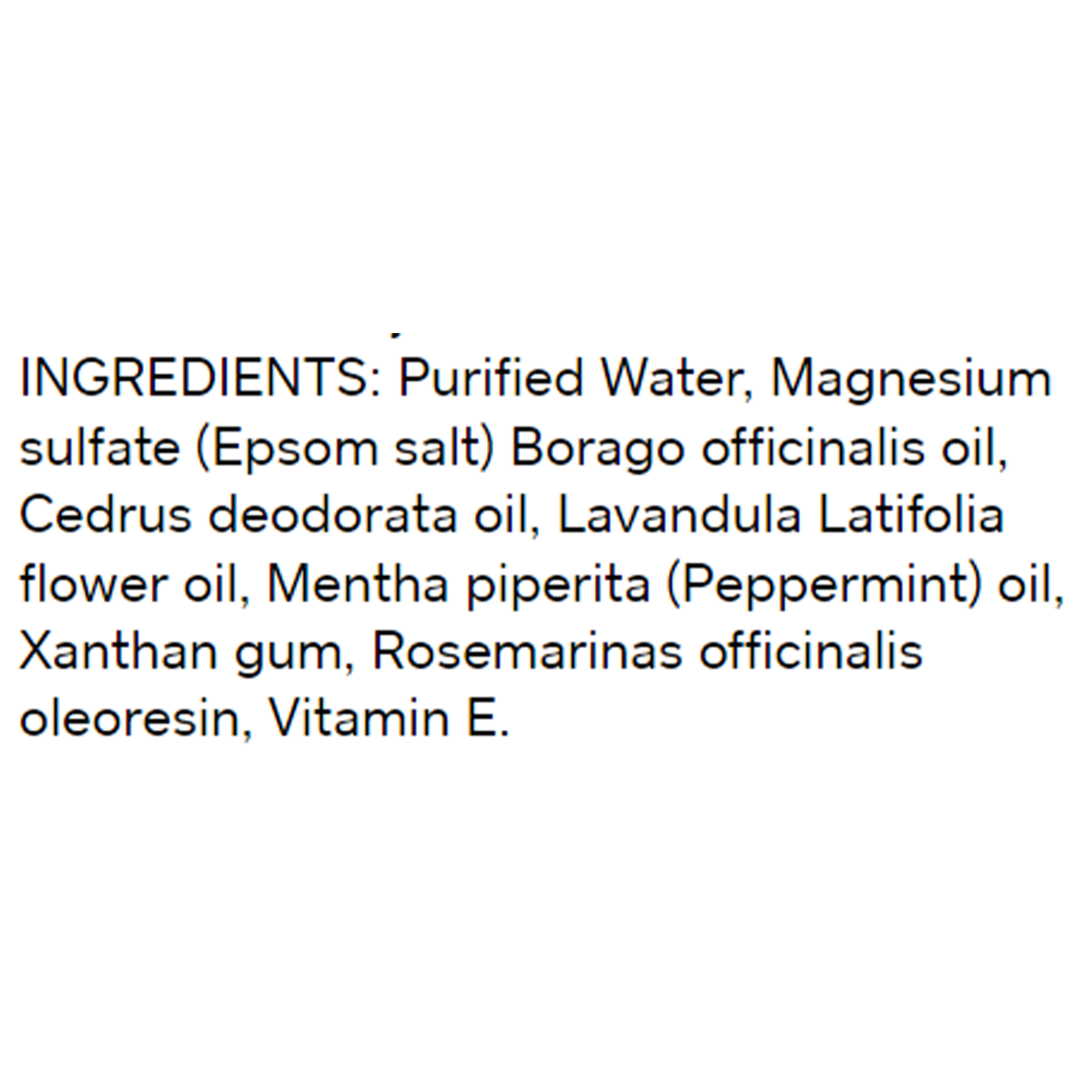 Purified Water, Magnesium sulfate (Epsom salt) Borago officinalis oil, Cedrus deodorata oil, Lavandula Latifolia flower oil, Mentha piperita (Peppermint) oil, Xanthan gum, Rosemarinas officinalis oleoresin, Vitamin E.