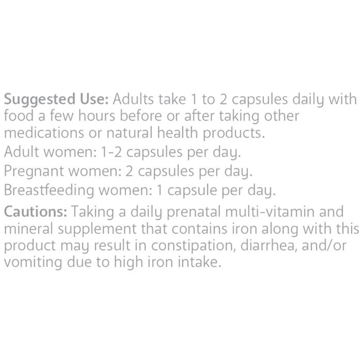 Adults take 1 to 2 capsules daily with food a few hours before or after taking other Health Products or natural health products. Adult women: 1-2 capsules per day. Pregnant women: 2 capsules per day. Breastfeeding women: 1 capsule per day.