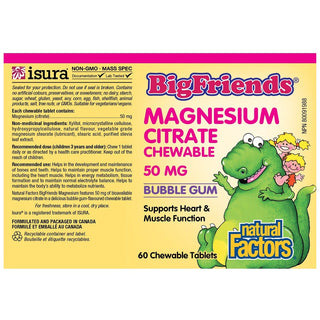 Natural Factors Big Friends Magnesium Citrate Bubble Gum 50mg 60 Chewable Tablets