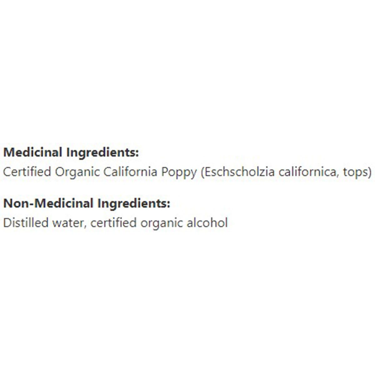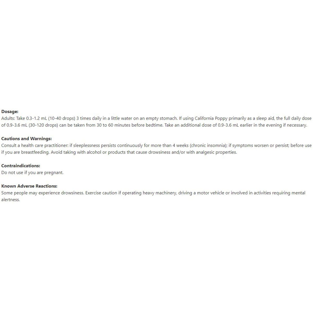 Adults: Take 0.3-1.2 mL (10-40 drops) 3 times daily in a little water on an empty stomach. If using California Poppy primarily as a Restful-Restful-Sleep aid, the full daily dose of 0.9-3.6 mL (30-120 drops) can be taken from 30 to 60 minutes before bedtime. Take an additional dose of 0.9-3.6 mL earlier in the evening if necessary.