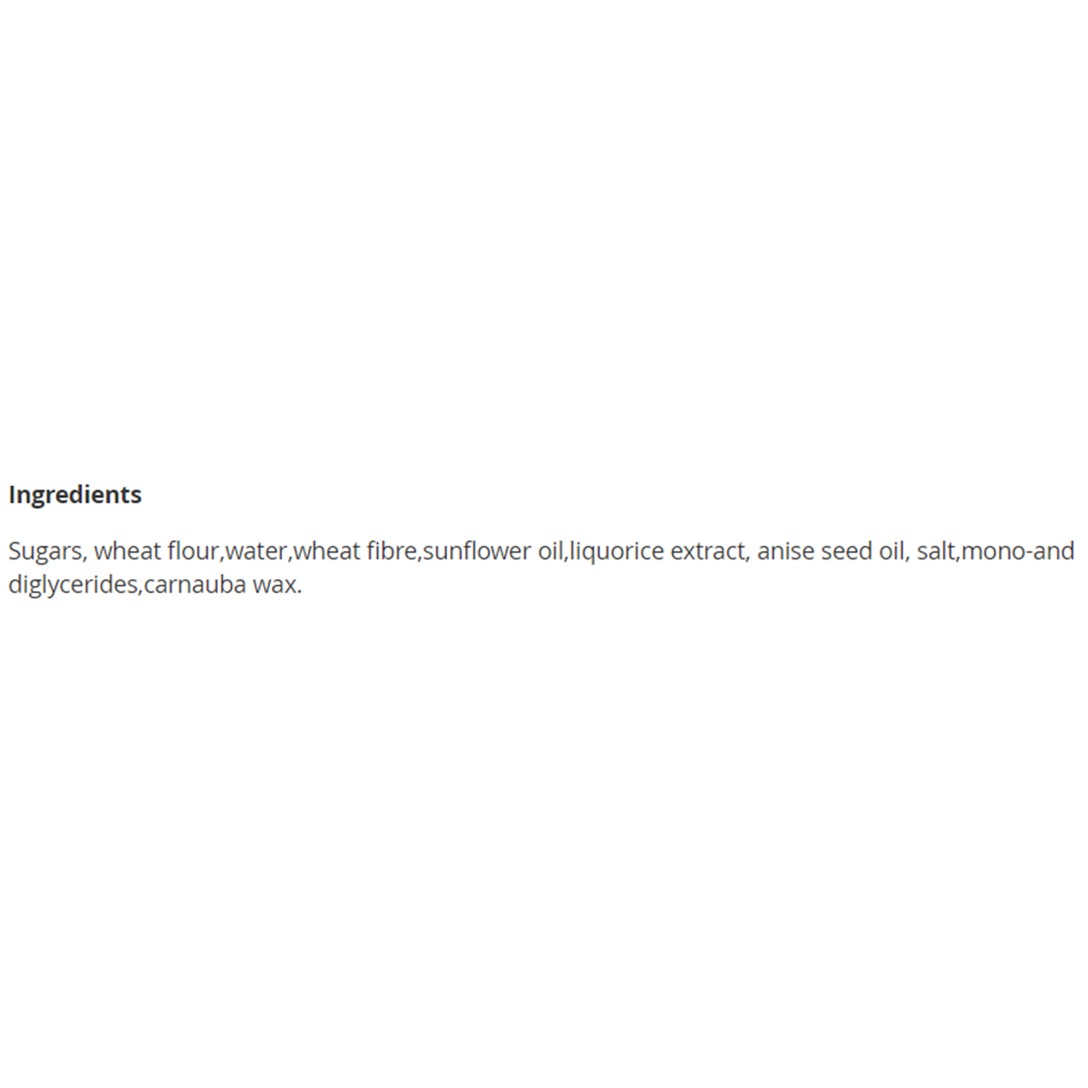 Sugars, wheat flour,water,wheat fibre,sunflower oil,liquorice extract, anise seed oil, salt,mono-and diglycerides,carnauba wax.