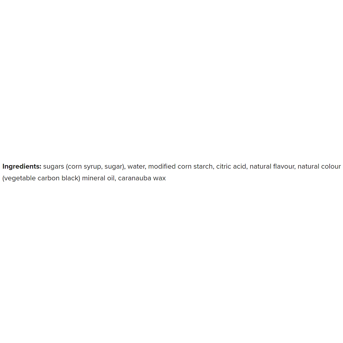 Sugars (corn syrup, sugar), water, modified corn starch, citric acid, natural flavour, natural colour (vegetable carbon black) mineral oil, caranauba wax.