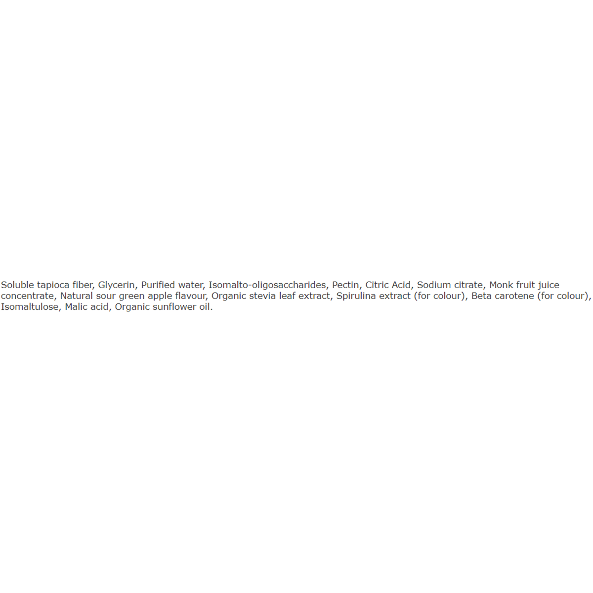Soluble tapioca fiber, Glycerin, Purified water, Isomalto-oligosaccharides, Pectin, Citric Acid, Sodium citrate, Monk fruit juice concentrate, Natural sour green apple flavour, Organic stevia leaf extract, Spirulina extract (for colour), Beta carotene (for colour), Isomaltulose, Malic acid, Organic sunflower oil.