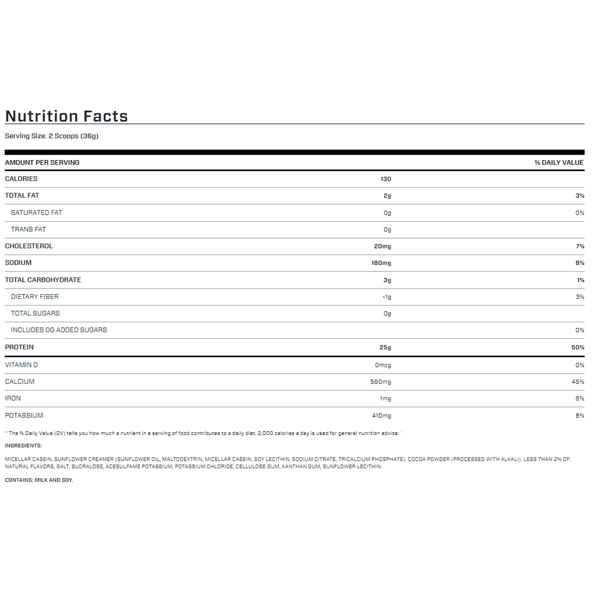 Micellar Casein, Sunflower Creamer (Sunflower Oil, Maltodextrin, Micellar Casein, Soy Lecithin, Sodium Citrate, Tricalcium Phosphate). Cocoa Powder (Processed With Alkali). Less Than 2% Of: Natural Flavors, Salt, Sucralose, Acesulfame Potassium, Potassium Chloride, Cellulose Gum, Xanthan Gum, Sunflower Lecithin.