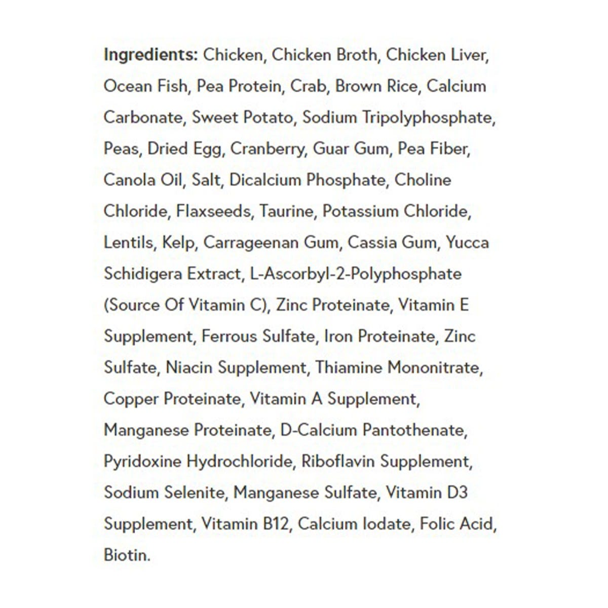 Chicken, Chicken Broth, Chicken Liver, Ocean Fish, Pea Protein, Crab, Brown Rice, Calcium Carbonate, Sweet Potato, Sodium Tripolyphosphate, Peas, Dried Egg, Cranberry, Guar Gum, Pea Fiber, Canola Oil, Salt, Dicalcium Phosphate, Choline Chloride, Flaxseeds, Taurine, Potassium Chloride, Lentils, Kelp, Carrageenan Gum, Cassia Gum, Yucca Schidigera Extract, L-Ascorbyl-2-Polyphosphate (Source Of Vitamin C), Zinc Proteinate, Vitamin E Supplement, Ferrous Sulfate, Iron Proteinate, Zinc Sulfate, Niacin Supplement, Thiamine Mononitrate, Copper Proteinate, Vitamin A Supplement, Manganese Proteinate, D-Calcium Pantothenate, Pyridoxine Hydrochloride, Riboflavin Supplement, Sodium Selenite, Manganese Sulfate, Vitamin D3 Supplement, Vitamin B12, Calcium Iodate, Folic Acid, Biotin.