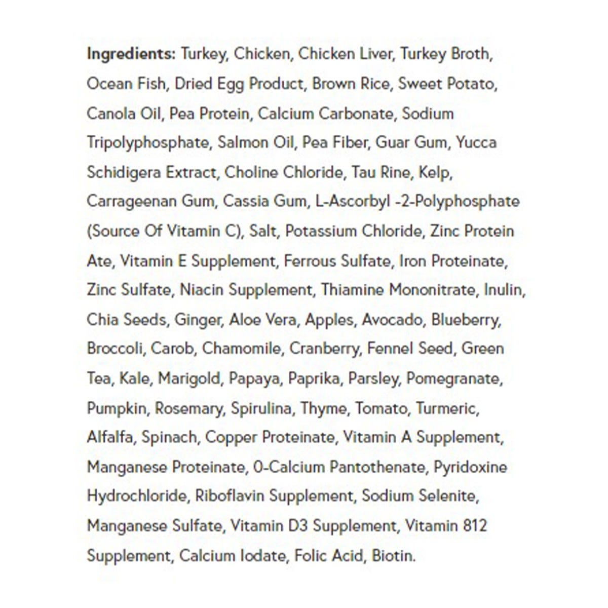 Turkey, Chicken, Chicken Liver, Turkey Broth, Ocean Fish, Dried Egg Product, Brown Rice, Sweet Potato, Canola Oil, Pea Protein, Calcium Carbonate, Sodium Tripolyphosphate, Salmon Oil, Pea Fiber, Guar Gum, Yucca Schidigera Extract, Choline Chloride, Tau Rine, Kelp, Carrageenan Gum, Cassia Gum, L-Ascorbyl -2-Polyphosphate (Source Of Vitamin C), Salt, Potassium Chloride, Zinc Protein Ate, Vitamin E Supplement, Ferrous Sulfate, Iron Proteinate, Zinc Sulfate, Niacin Supplement, Thiamine Mononitrate, Inulin, Chia Seeds, Ginger, Aloe Vera, Apples, Avocado, Blueberry, Broccoli, Carob, Chamomile, Cranberry, Fennel Seed, Green Tea, Kale, Marigold, Papaya, Paprika, Parsley, Pomegranate, Pumpkin, Rosemary, Spirulina, Thyme, Tomato, Turmeric, Alfalfa, Spinach, Copper Proteinate, Vitamin A Supplement, Manganese Proteinate, 0-Calcium Pantothenate, Pyridoxine Hydrochloride, Riboflavin Supplement, Sodium Selenite, Manganese Sulfate, Vitamin D3 Supplement, Vitamin 812 Supplement, Calcium Iodate, Folic Acid, Biotin.