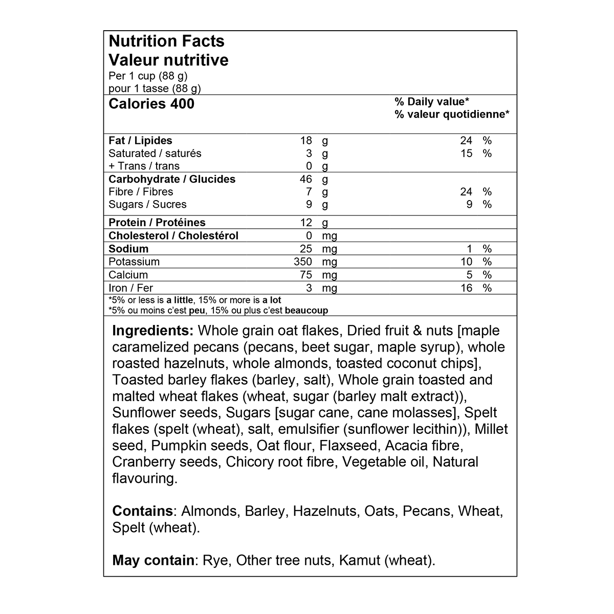 Whole grain oat flakes, Dried fruit & nuts [maple caramelized pecans (pecans, beet sugar, maple syrup), whole roasted hazelnuts, whole almonds, toasted coconut chips], Toasted barley flakes (barley, salt), Whole grain toasted and malted wheat flakes (wheat, sugar (barley malt extract)), Sunflower seeds, Sugars [sugar cane, cane molasses], Spelt flakes (spelt (wheat), salt, emulsifier (sunflower lecithin)), Millet seed, Pumpkin seeds, Oat flour, Flaxseed, Acacia fibre, Cranberry seeds, Chicory root fibre, Vegetable oil, Natural flavouring.