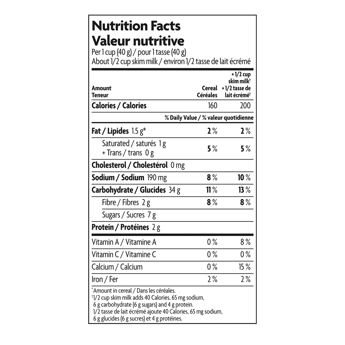 1/2 cup skim milk adds 40 calories, 65 mg sodium, 6 g carbohydrate (6 g sugars) and 4 g protein.