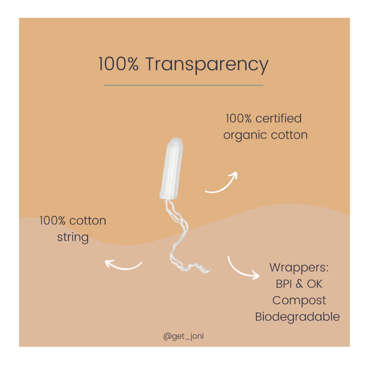 You deserve a higher standard of transparency. joni tampons are made with 100% organic GOTS certified cotton — even the string.