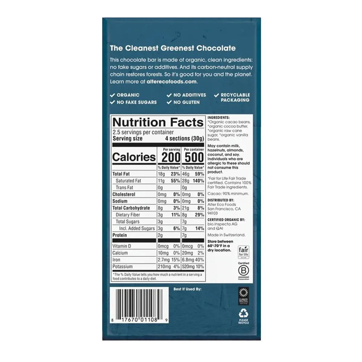 Organic cacao beans, organic cocoa butter, organic raw cane sugar, organic vanilla beans.