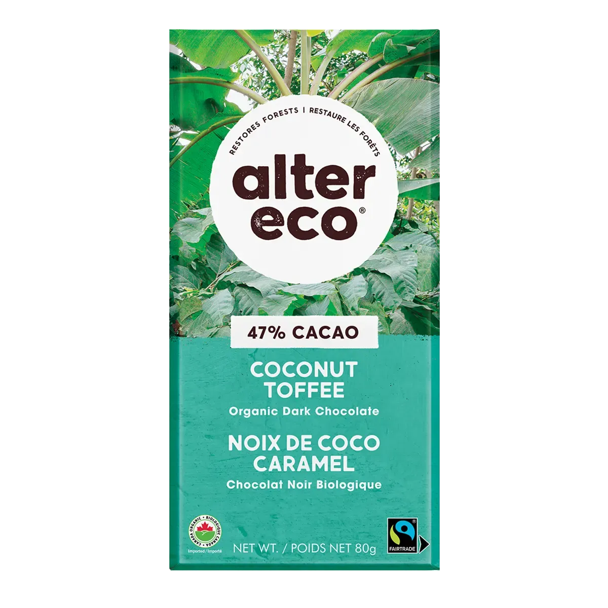 Toffee lovers, unite! This beloved traditional confection gets the gourmet Fair Trade Health-Wellness-Car-e. Roasty-toasty Sri Lankan coconut and caramalized Paraguayan cane sugar are sprinkled with coarse French sea salt to form a unique and supremely satisfying crunch. Dunked in this velvety Peruvian dark chocolate, this lush, tropical toffee delivers buttery, salty sweetness in every bite.