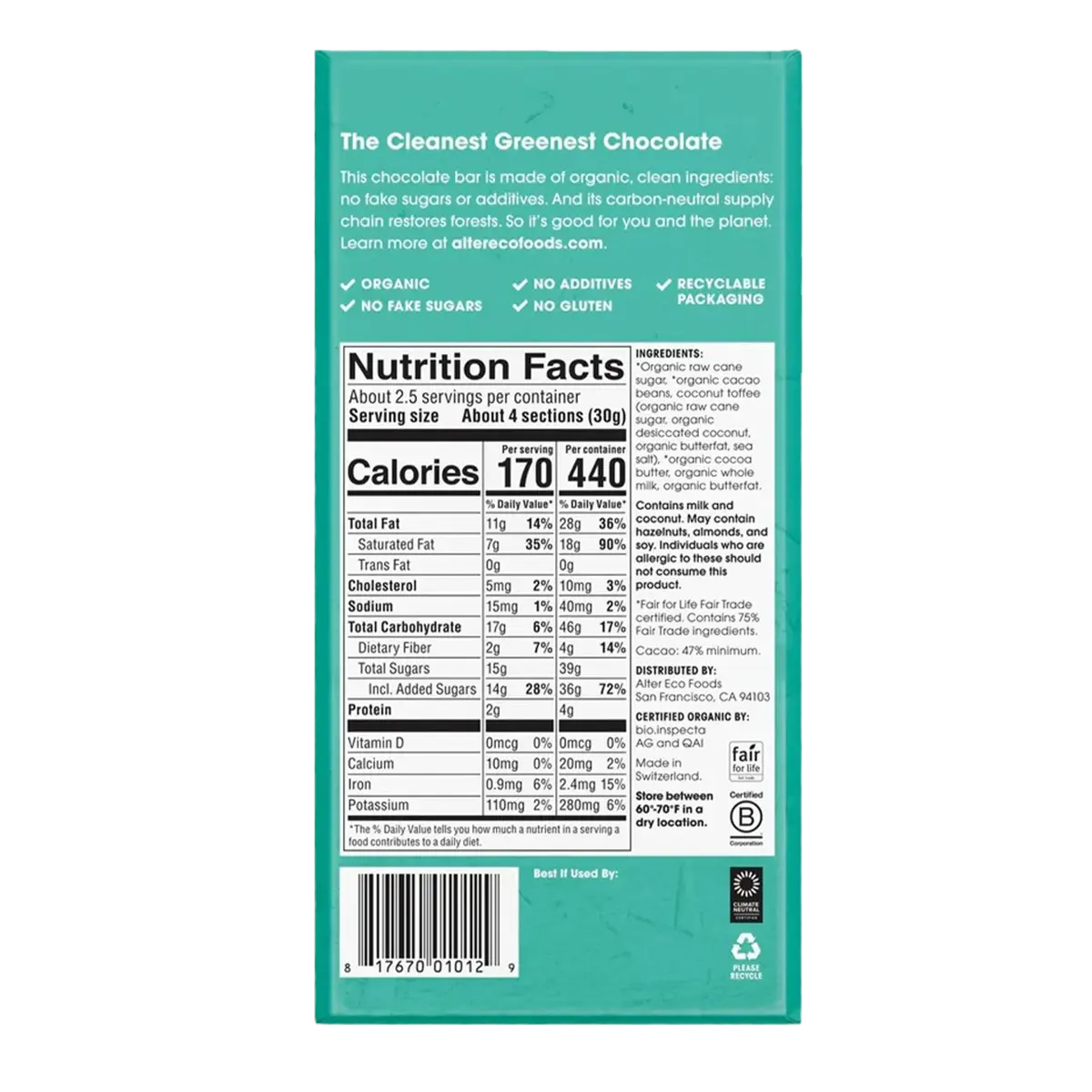 Organic raw cane sugar, organic cacao beans, organic coconut toffee (organic raw cane sugar, organic desiccated coconut, organic butter, sea salt), organic cocoa butter, organic whole milk, organic butterfat.