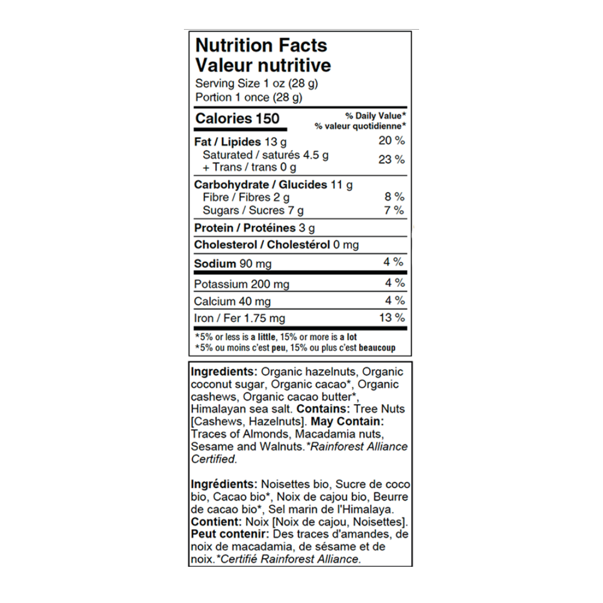 Organic hazelnuts, Organic coconut sugar, Organic cacao*, Organic cashews, Organic cacao butter*, Himalayan sea salt.