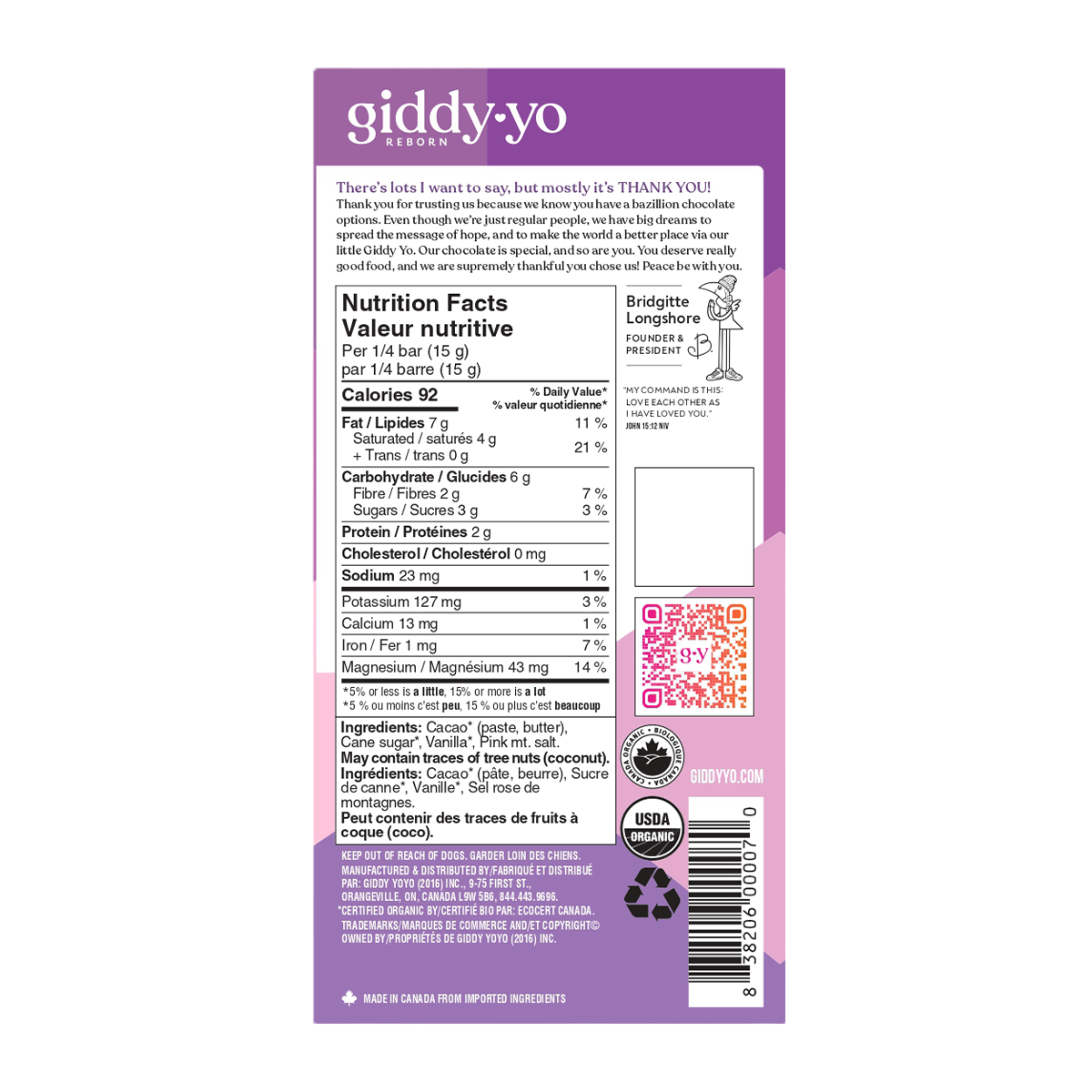 Cacao* (paste, butter), Cane sugar*, Vanilla*, Pink mt. salt.