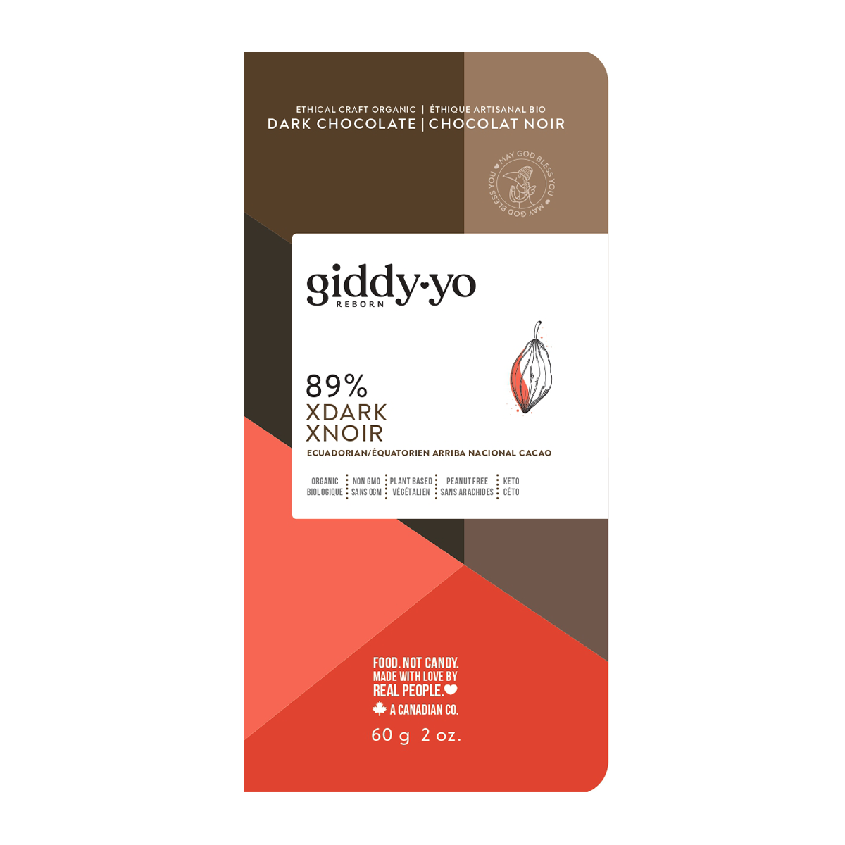 A Giddy Yo best seller, the 89% XDARK is a pleasant surprise! Smooth and just sweet enough, this bar lacks the bitterness typical of most chocolates in this darkness range. Handmade with only two ingredients—heirloom specialty cacao and award-winning cane—this bar exemplifies purity and simplicity. Step out of your comfort zone and give it a try; you won’t be disappointed!