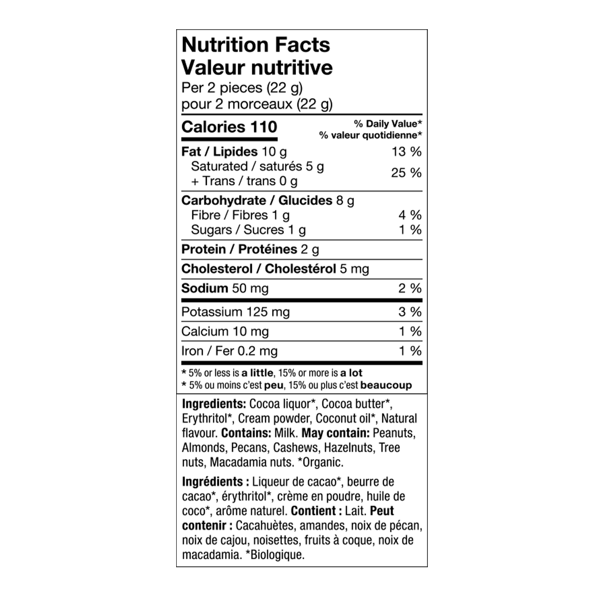 Cocoa liquor*, Cocoa butter*, Erythritol, Cream powder, Coconut oil*, Natural flavour.