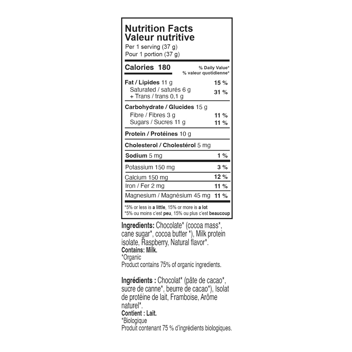 Chocolate" (cocoa mass", cane sugar, cocoa butter *), Milk protein isolate, Raspberry, Natural flavor.