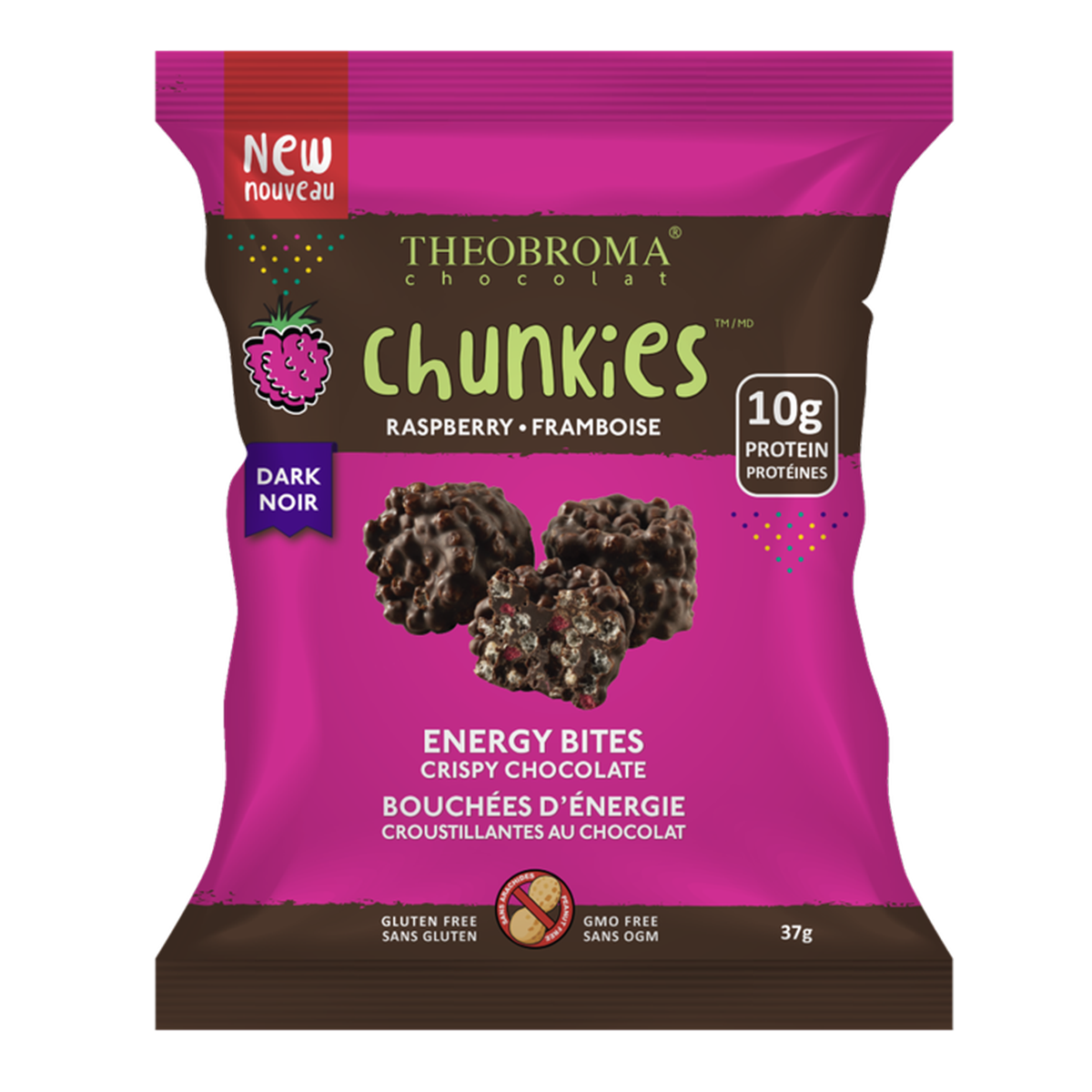 What’s not to love about our 60% dark chocolate with raspberry Chunkies? You’ll adore these delicious, fun, low calorie, all-natural and nutritional crispy chocolate energy bites. Dark chocolate and crunchy raspberry chunks are balanced with steamed milk foamed in a perfect crispy texture. It provides a melt-in-your-mouth experience for your taste buds. Adult and kid-friendly, each pouch of nine energy bites is the perfect item to keep in your handbag, office drawer, sports bag or kids’ lunchboxes. This product is always good for you and the planet because it contains 10g of protein, less than 180 calories, and less than 6 ingredients.