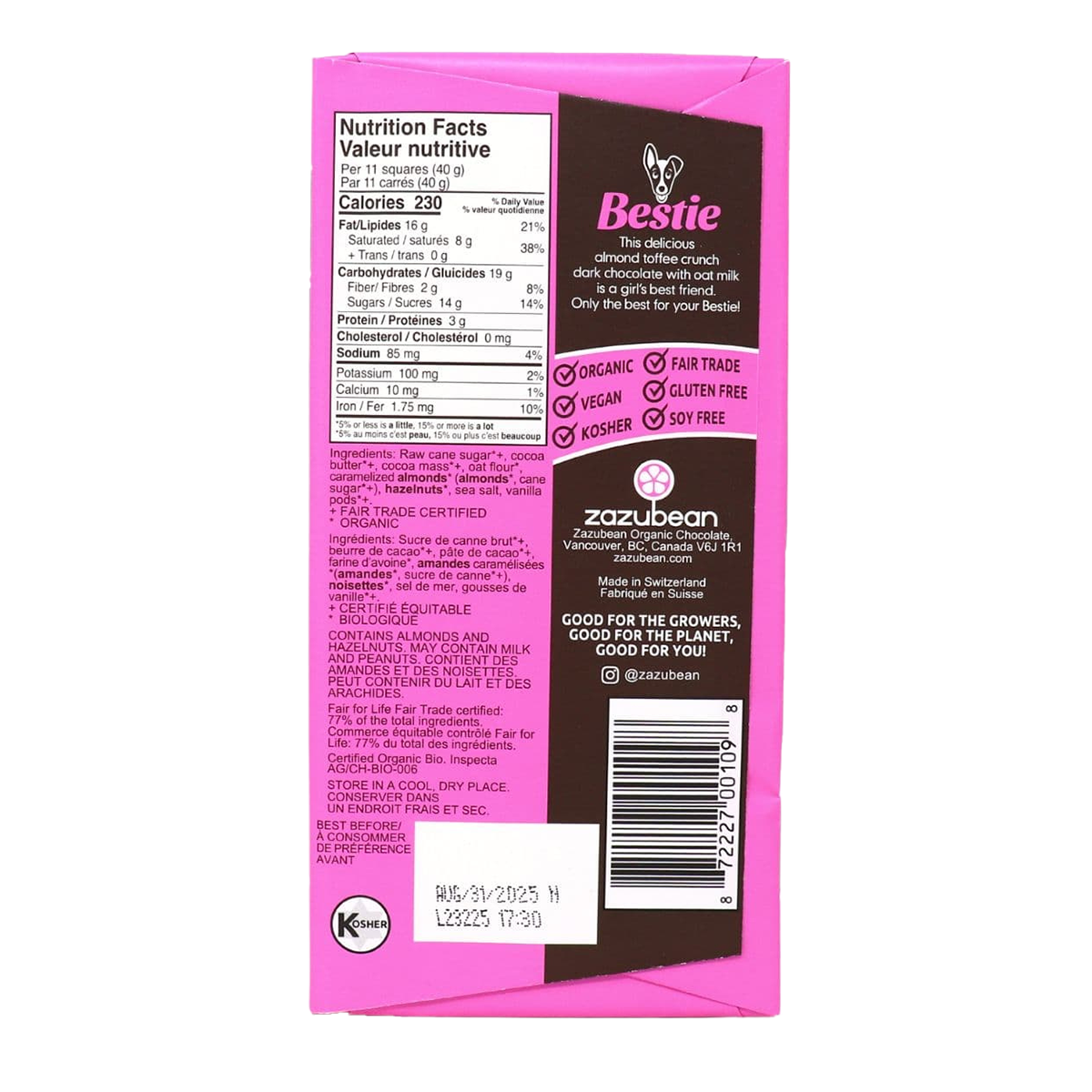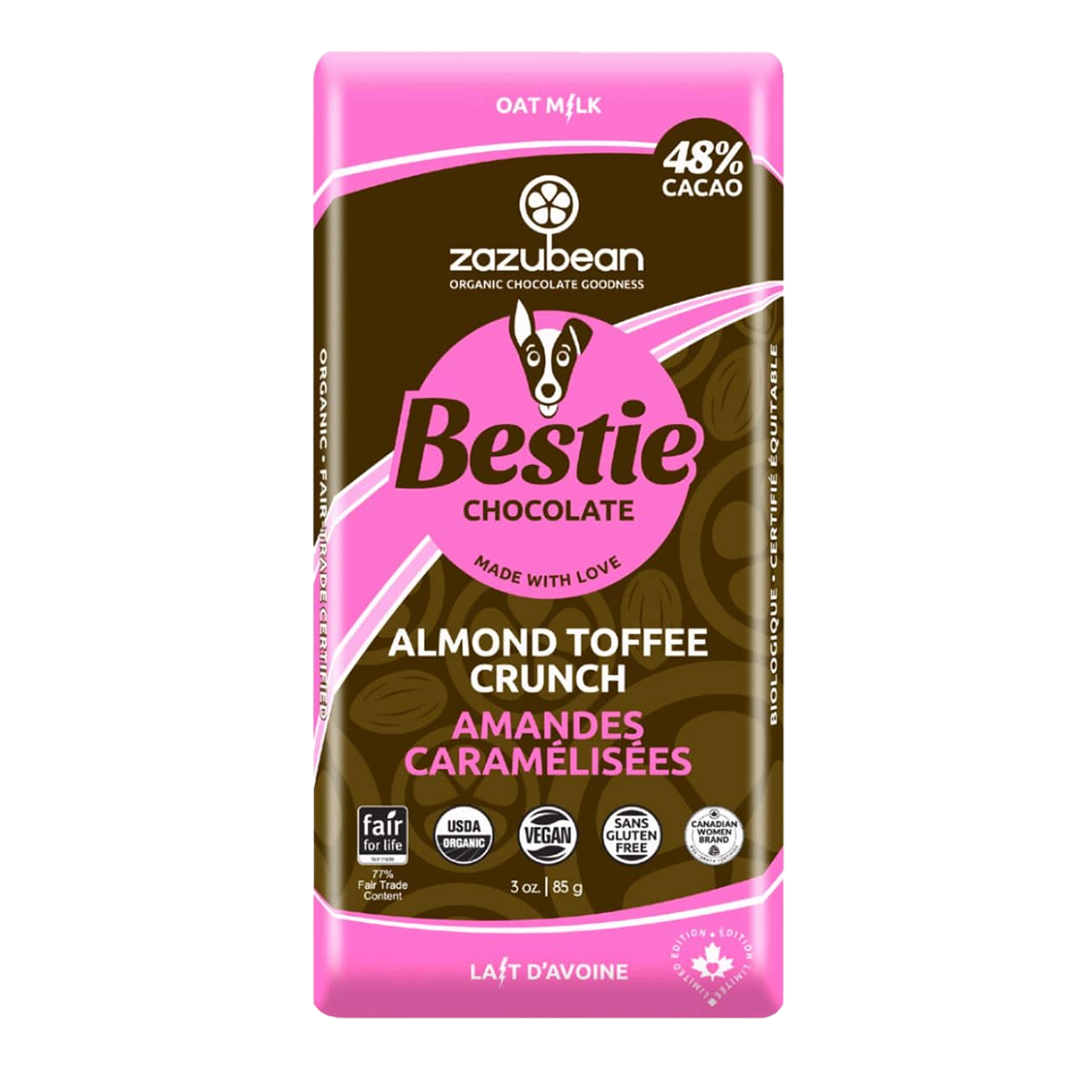Introducing your latest culinary companion, your steadfast ally, your co-conspirator in chocolate indulgence, Zazubean's Bestie chocolate bar! Featuring velvety oat milk chocolate generously adorned with the enticing crunch of caramelized almond toffee, it embodies the essence of your dependable confidant, consistently uplifting your mood and adding a hint of sweetness to your day! Because you deserve excellence, and this vegan milk chocolate bar is here to ensure you receive nothing less!