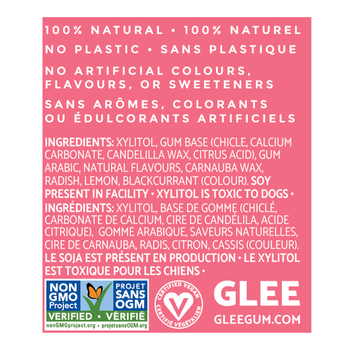 Xylitol, Gum Base (Chicle, Calcium Carbonate, Candelilla Wax, Citrus Acid), Gum Arabic, Natural Flavours, Carnauba Wax, Radish, Lemon, Blackcurrant (Colour). Soy Present In Facility Xylitol Is Toxic To Dogs.