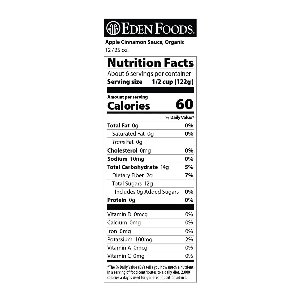 EDEN Cinnamon Apple Sauce provides better flavor, better nutrition, and peace of mind. It's fat free, very low in sodium, and contains no refined sugars. A good source of Nutrition Planary fiber. Made without any chemical additives of any kind.