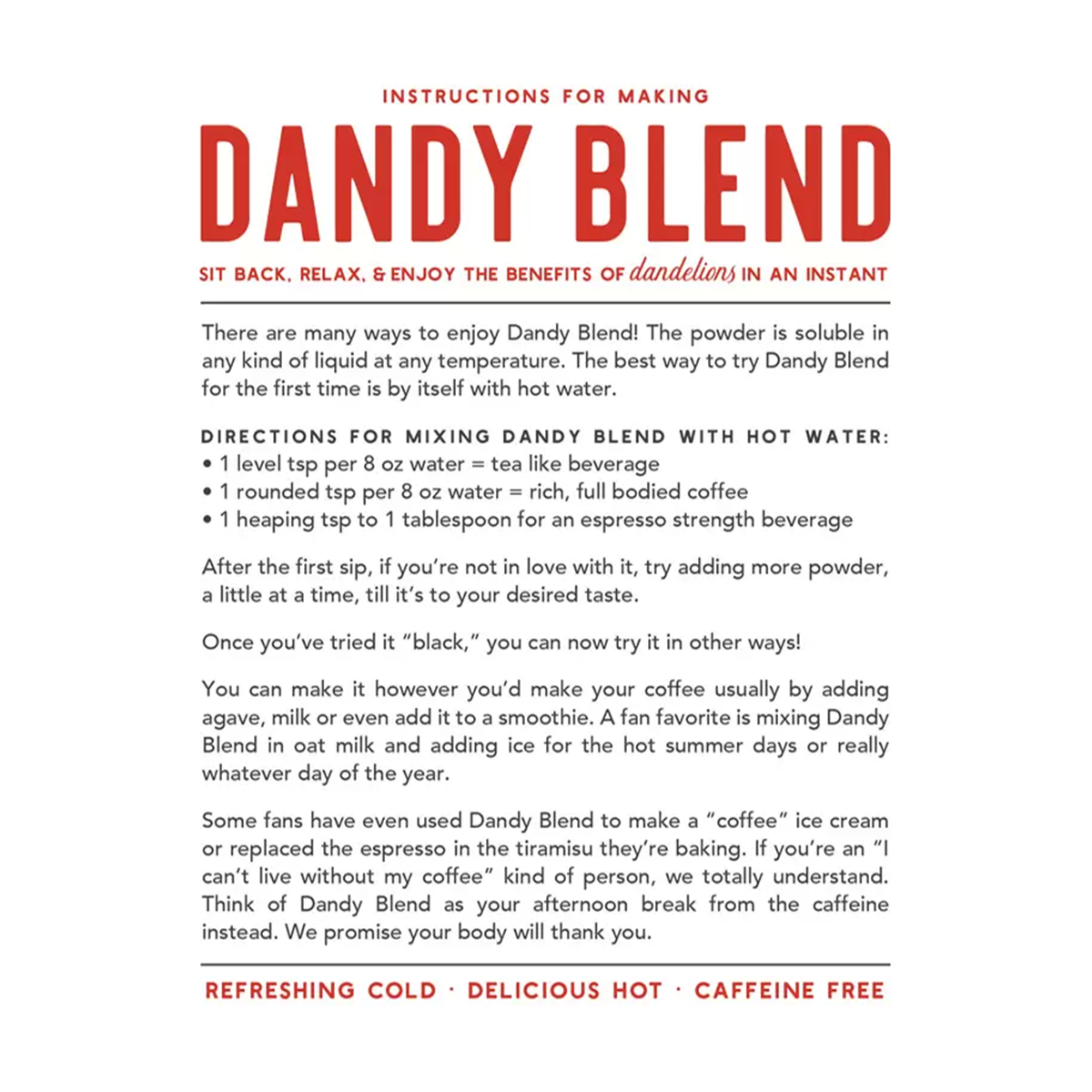 Dandy Blend is a caffeine-free herbal beverage and coffee alternative made of only four ingredients. Enjoy the rich, bold, and creamy flavor of real coffee without the jitters. It’s “All The Goodness of Dandelion In An Instant.”