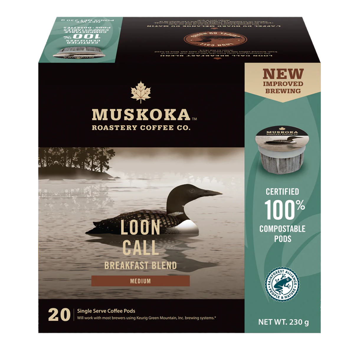 What could be more emblematic of Muskoka than the call of the common loon? The tremolo, which sounds like a crazy laugh, is the most familiar and distinctive call, and is used to signal alarm or worry. You are more likely to hear the wait in the morning, as you enjoy your coffee and danish, when loons signal that they want to move closer together or that it is safe for the chicks to join them for food. This coffee has become one of This most popular, as people respond to the subtle character and layers of taste. The inclusion of Kenyan in the blend gives the coffee a brightness with complex tones of fruit and berry.