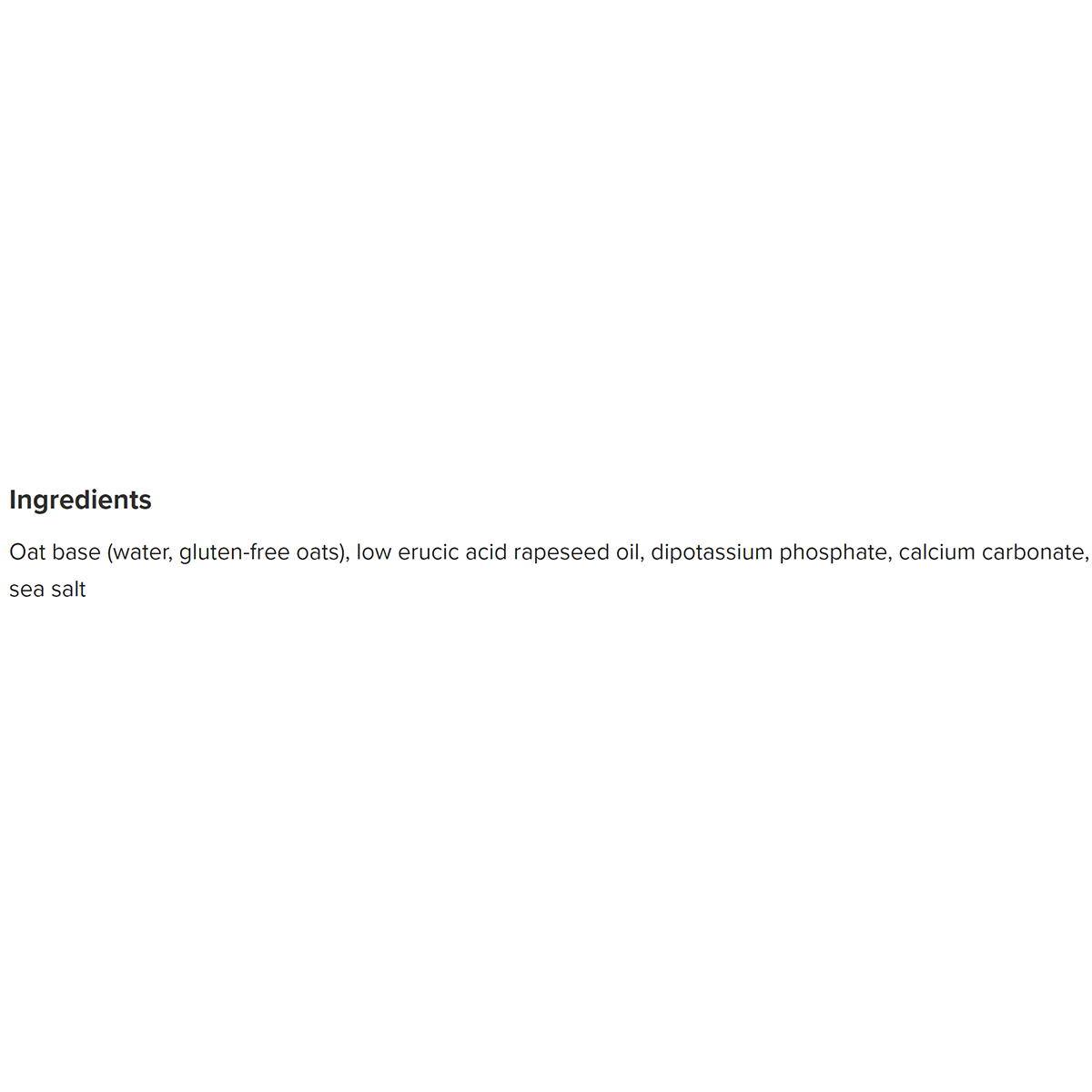 Oat base (water, gluten-free oats), low erucic acid rapeseed oil, dipotassium phosphate, calcium carbonate, sea salt.