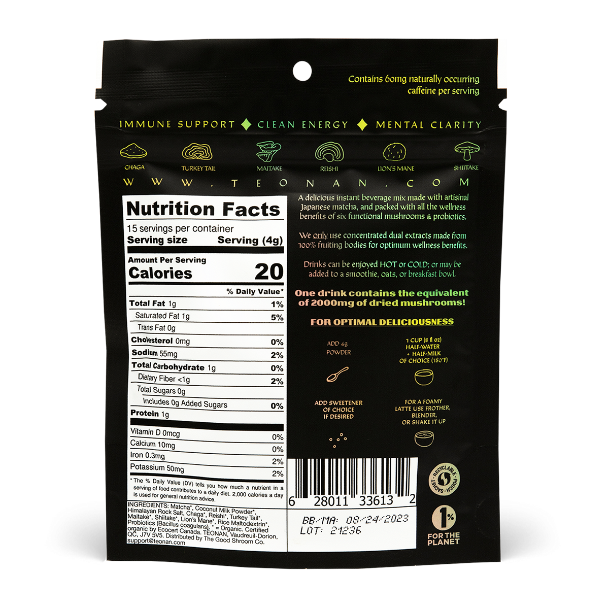 Matcha", Coconut Milk Powder, Himalayan Rock Salt, Chaga", Reishi", Turkey Tail", Maitake, Shiitake", Lion's Mane, Rice Maltodextrin, Probiotics (Bacillus coagulans), Organic. Certified organic by Ecocert Canada.