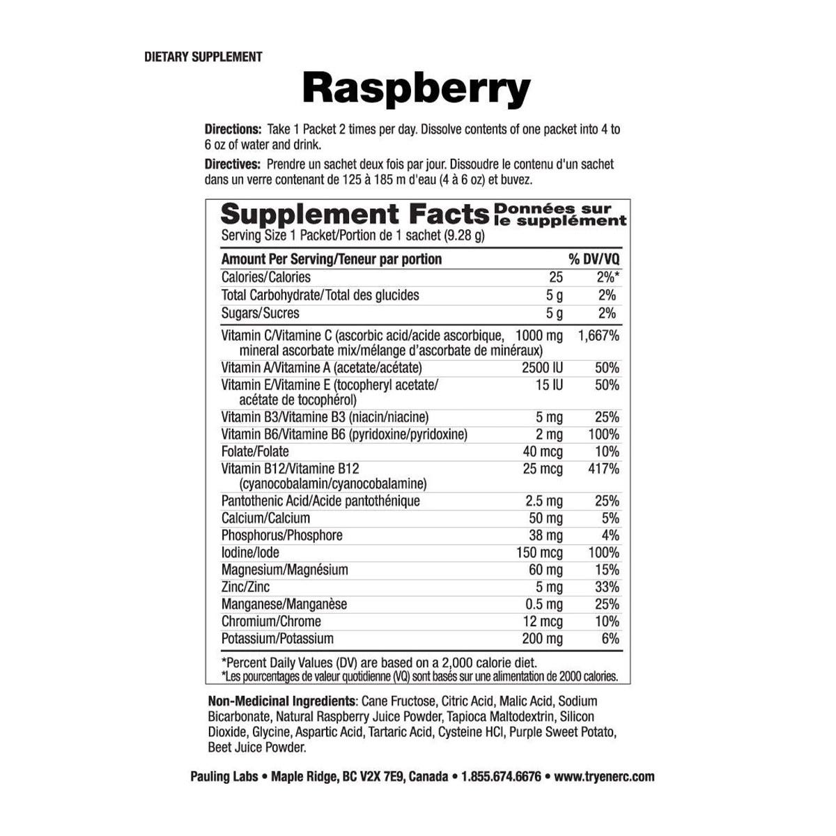Cane Fructose, Citric Acid, Malic Acid, Sodium Bicarbonate, Natural Raspberry Juice Powder, Tapioca Maltodextrin, Silicon Dioxide, Glycine, Aspartic Acid, Tartaric Acid, Cysteine HCI, Purple Sweet Potato, Beet Juice Powder.