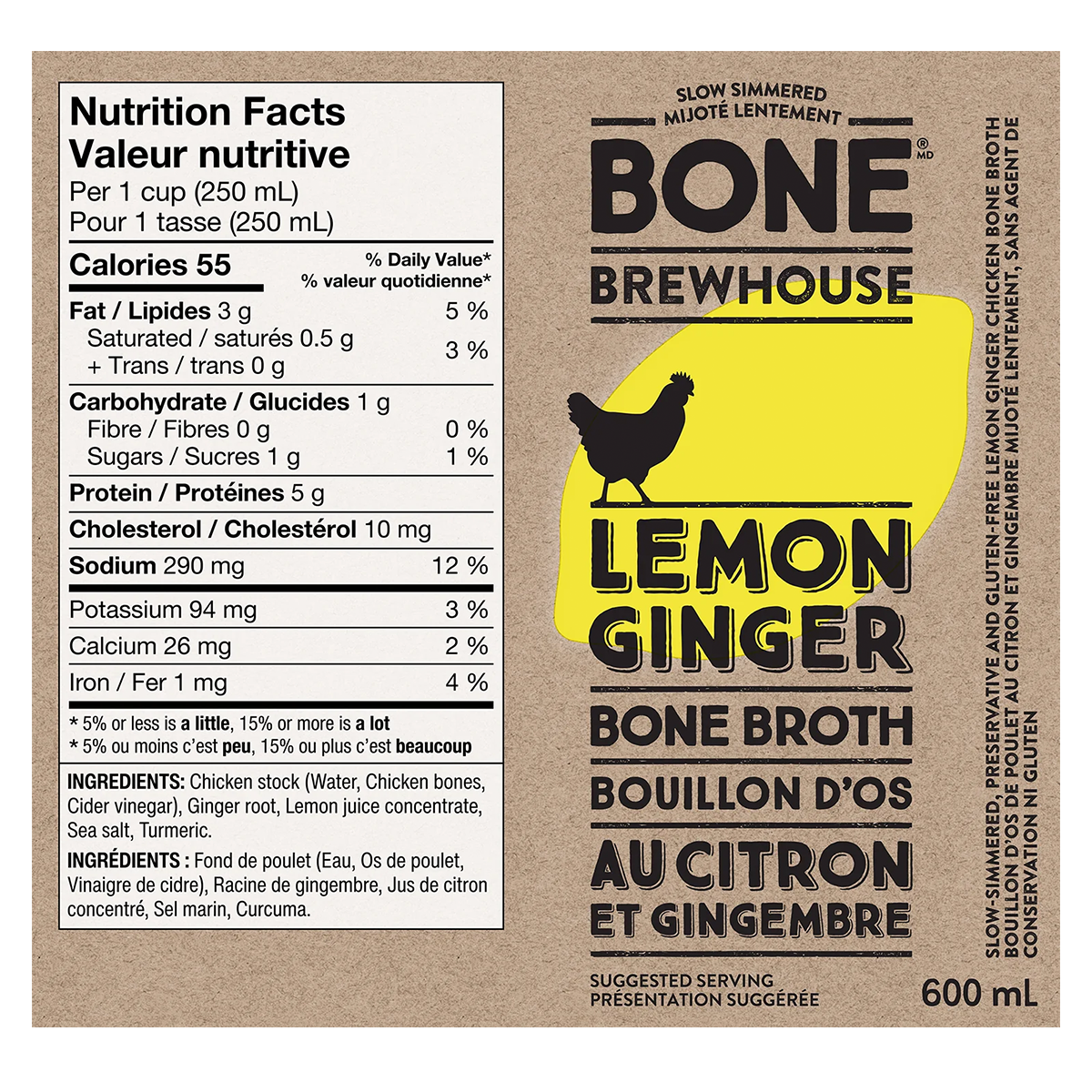 Chicken stock (Water, Chicken bones, Cider vinegar), Ginger root, Lemon juice concentrate, Sea salt, Turmeric.