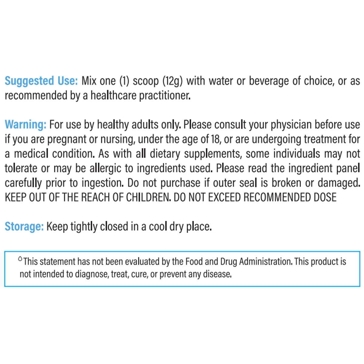 Mix one (1) scoop (12g) with water or beverage of choice, or as recommended by a healthcare practitioner.