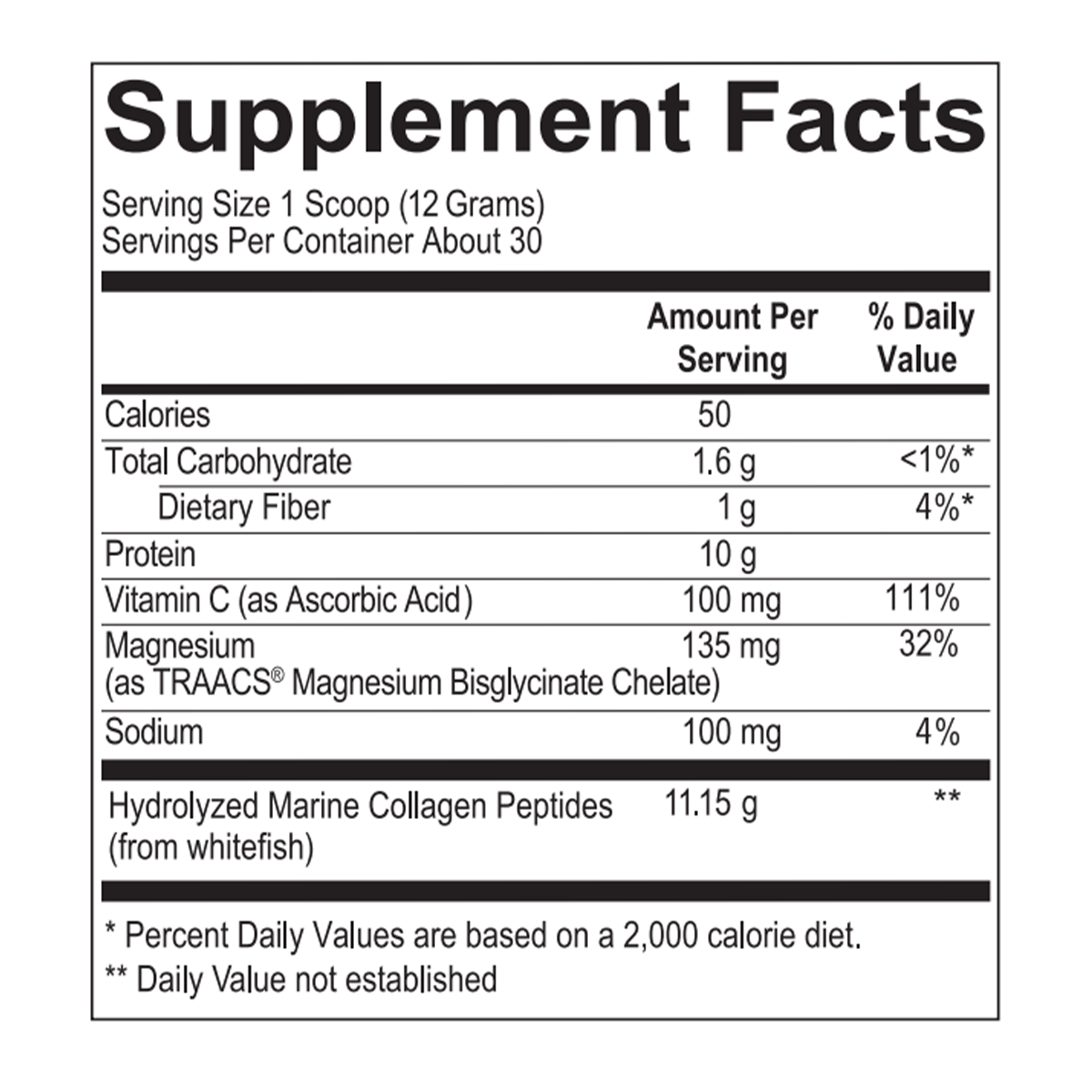 This Collagen Powder is a potent, halal-certified formula designed to Aid various aspects of everyday health. It is made with the finest natural ingredients, including our patented TRAACS Magnesium and hydrolyzed marine collagen peptides sourced from whitefish. Hydrolyzed collagen has several health benefits; it Assists to promote the integrity of joints and combats the adverse effects of aging by improving the quality of skin, hair, and nails.