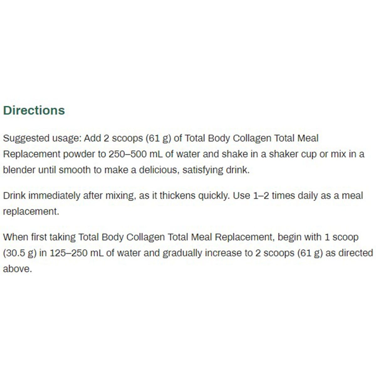 When first taking Total Body Collagen Total Meal Replacement, begin with 1 scoop (30.5 g) in 125–250 mL of water and gradually increase to 2 scoops (61 g) as directed above.