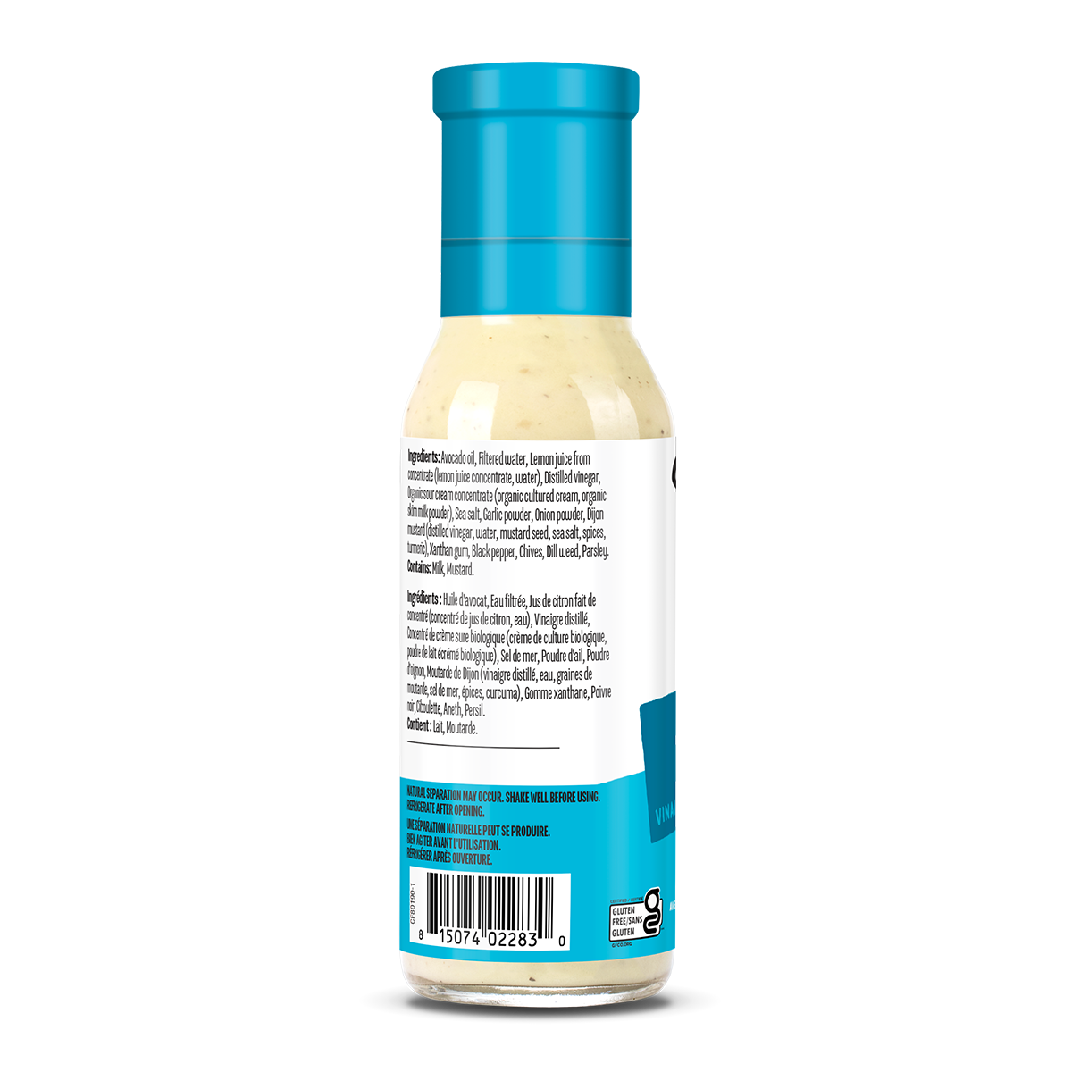 Avocado all Fitered water, lemon juice from concentrate (lemon juice concentrate, water) Distilled Vinegar, Organic sour cream concentrate (organic cultured cream, organic skim milk powder) Sea salt, Garlic powder, Orion powder, Dijon mustard(distilled vinegar, water, mustard seed, sea salt, spices, turmeric), Xanthan gum, Black pepper Chives, Dill weed Parsley.